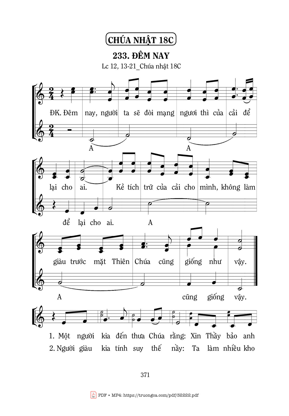 Điệp khúc: Đêm nay, người ta sẽ đòi mạng ngươi thì của cải để lại cho ai. Kẻ tích trữ của cải cho mình, không làm giàu trước mặt Thiên Chúa cũng giống như vậy.