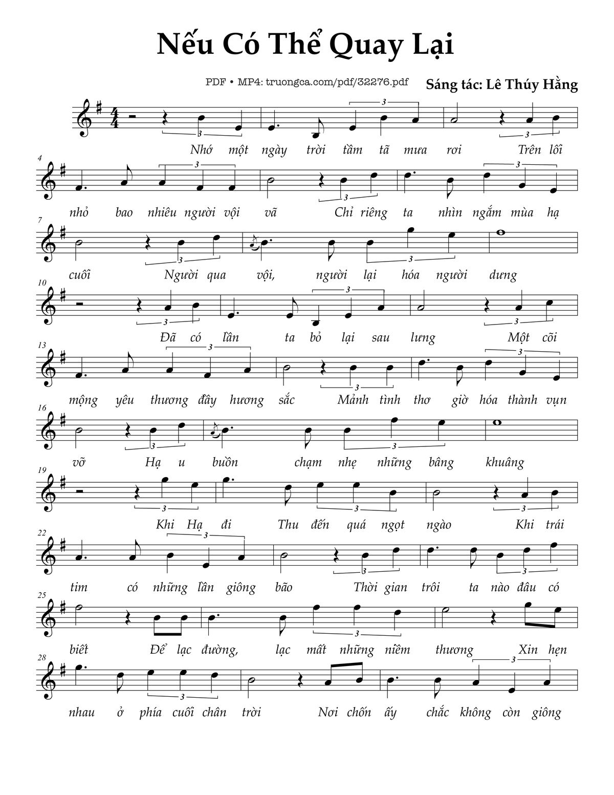 Phần nghe hát Nếu có thể quay lại (Lê Thúy Hằng) được nhúng từ Youtube, Musescore hoặc link ngoài và chịu sự kiểm soát bản quyền của bên thứ ba đó, vì vậy có thể bị xóa hoặc chèn quảng cáo bất kỳ lúc nào. Nếu bạn không nghe - xem được ca sĩ hát tức là đã bị Youtube hoặc Musescore kiểm soát.