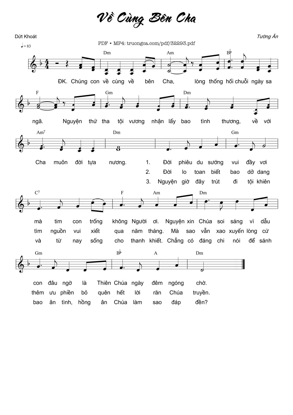Điệp khúc: Chúng con về cùng bên Cha, lòng thống hối chuỗi ngày sa ngã. Nguyện thứ tha tội vương nhận lấy bao tình thương, về với Cha muôn đời tựa nương.