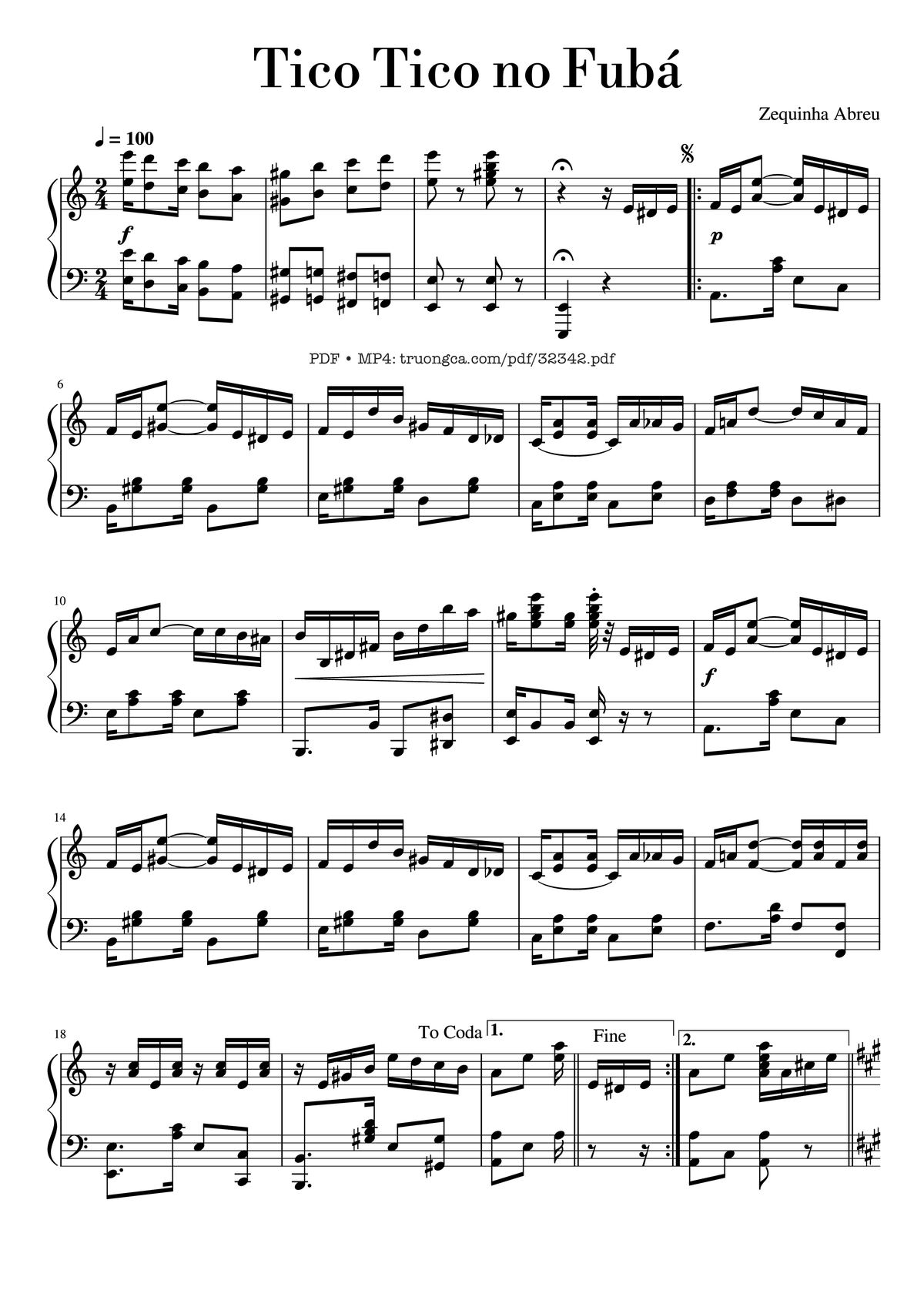 Phần đàn mẫu Tico Tico no fubá Piano (Zequinha Abreu) được nhúng từ Youtube, Musescore hoặc link ngoài và chịu sự kiểm soát bản quyền của bên thứ ba đó, vì vậy có thể bị xóa hoặc chèn quảng cáo bất kỳ lúc nào. Nếu bạn không nghe - xem được phần đàn mẫu hát mẫu tức là đã bị Youtube/Musescore kiểm soát.