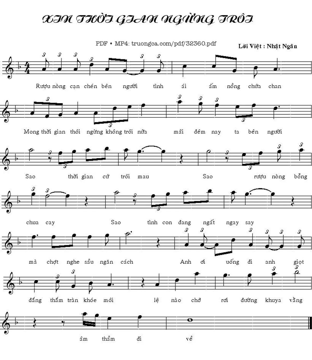 Sheet nhạc có nốt Xin Thời Gian Ngừng Trôi của nhạc sĩ Nhật Ngân và file PDF nốt nhạc đăng lên đây nhằm giúp các bạn xướng âm cho đúng nốt và hát thêm hay, chỉ mang tính chất tham khảo, không có mục đích thương mại. Bản quyền thuộc về tác giả và tổ chức nắm bản quyền, Truongca.com không giữ bất kỳ bản quyền của nội dung nào cả. Các bạn có thể tải về bản PDF chất lượng cao, gồm khuông nhạc có nốt với đường link file PDF bên trên.