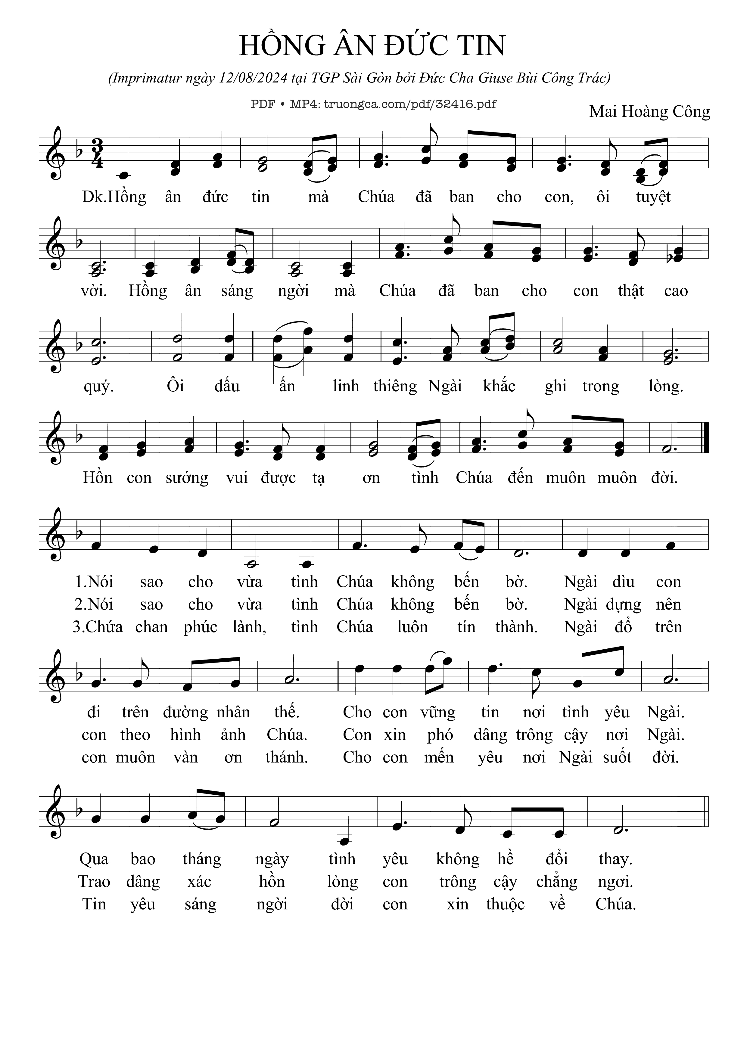 Sheet nhạc có nốt Hồng Ân Đức Tin của nhạc sĩ Mai Hoàng Công và file PDF nốt nhạc đăng lên đây nhằm giúp các bạn xướng âm cho đúng nốt và hát thêm hay, chỉ mang tính chất tham khảo, không có mục đích thương mại. Bản quyền thuộc về tác giả và tổ chức nắm bản quyền, Truongca.com không giữ bất kỳ bản quyền của nội dung nào cả. Các bạn có thể tải về bản PDF chất lượng cao, gồm khuông nhạc có nốt với đường link file PDF bên trên.