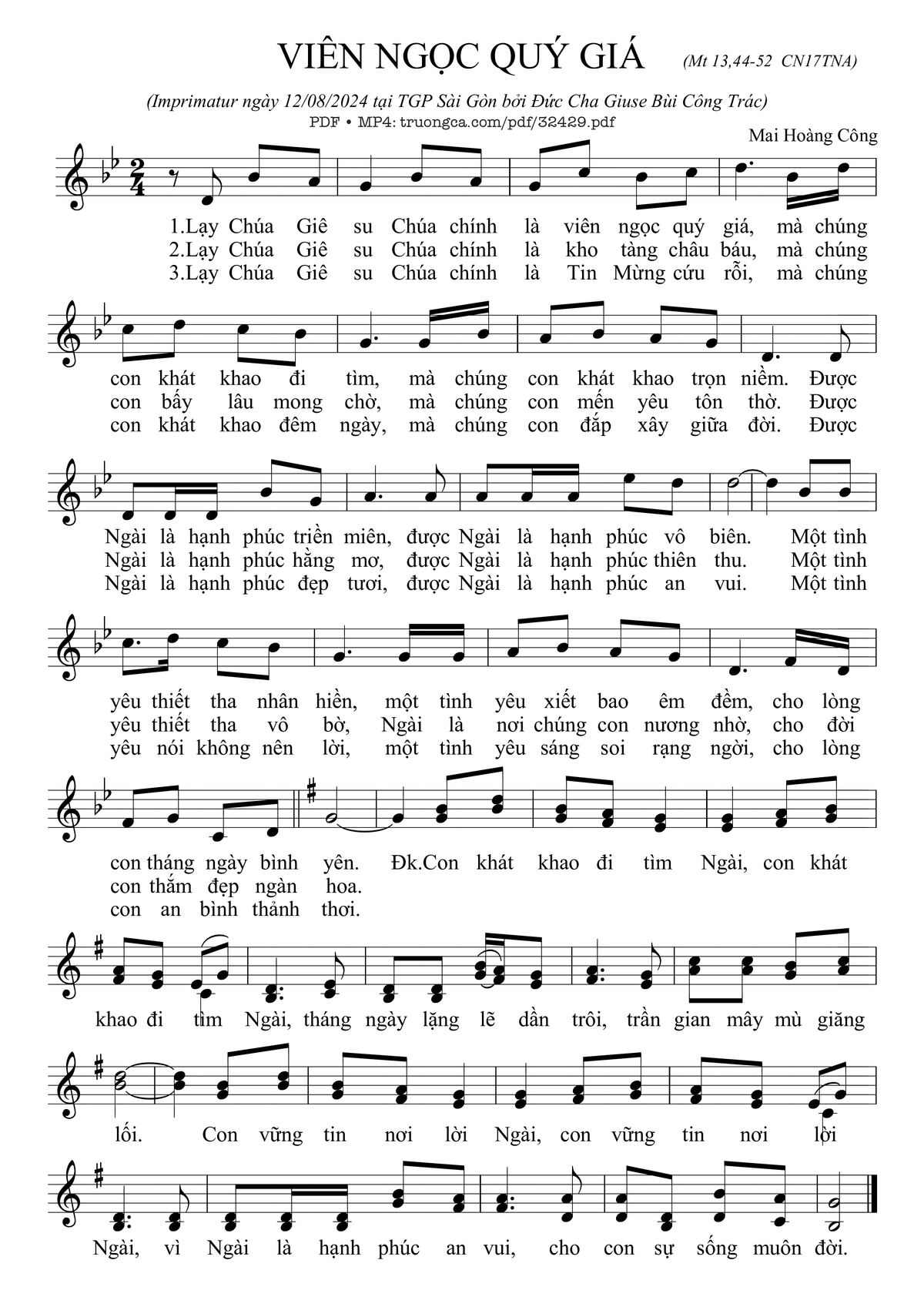 Sheet nhạc có nốt Viên Ngọc Quý Giá của nhạc sĩ Mai Hoàng Công và file PDF nốt nhạc đăng lên đây nhằm giúp các bạn xướng âm cho đúng nốt và hát thêm hay, chỉ mang tính chất tham khảo, không có mục đích thương mại. Bản quyền thuộc về tác giả và tổ chức nắm bản quyền, Truongca.com không giữ bất kỳ bản quyền của nội dung nào cả. Các bạn có thể tải về bản PDF chất lượng cao, gồm khuông nhạc có nốt với đường link file PDF bên trên.