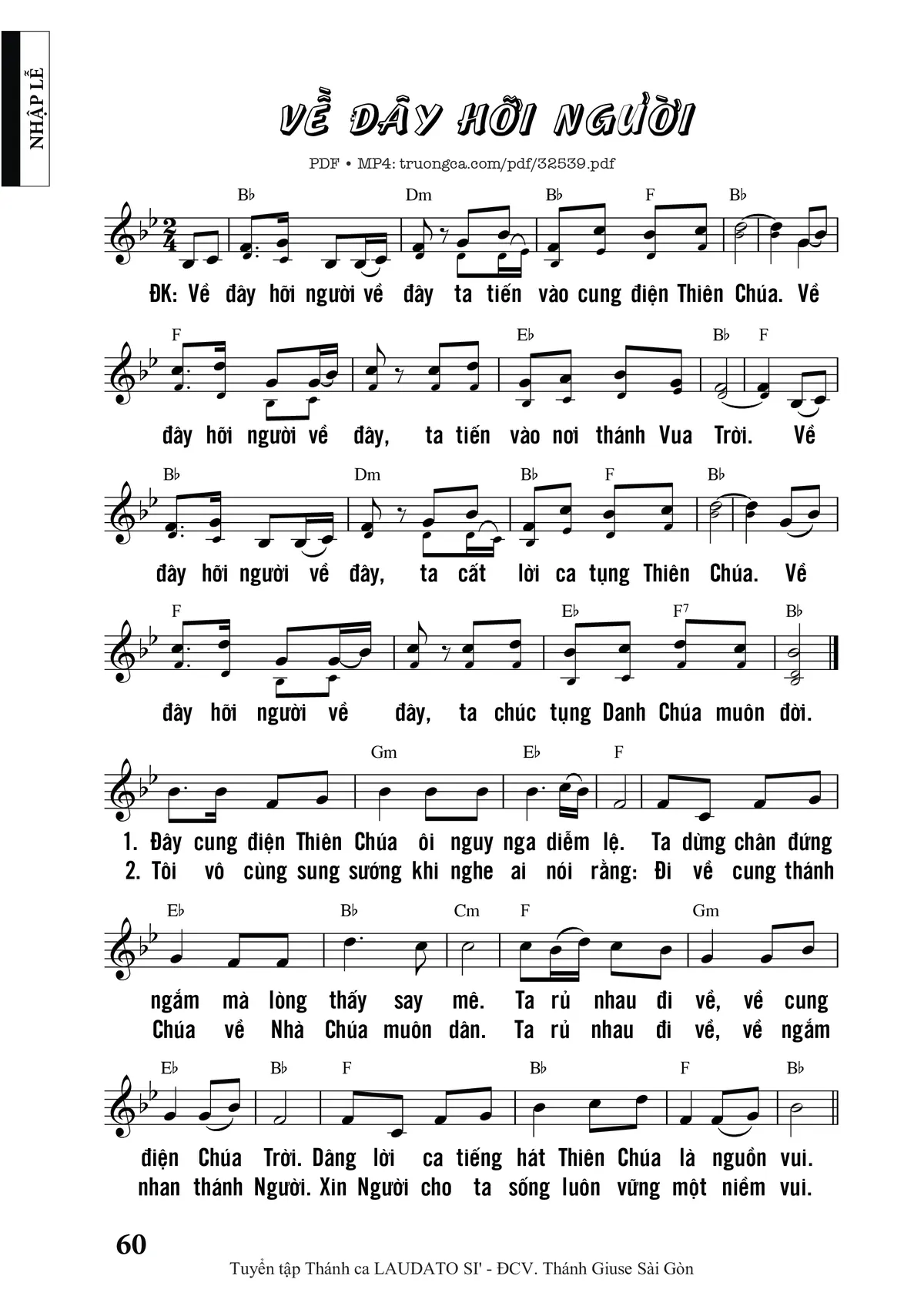 Điệp khúc: Về đây hỡi người về đây, ta tiến vào cung điện Thiên Chúa. Về đây hỡi người về đây ta tiến vào nơi Thánh Vua Trời. Về đây hỡi người về đây, ta cất lời ca ngợi Thiên Chúa. Về đây hỡi người về đây, ta chúc tụng Danh Chúa muôn đời.