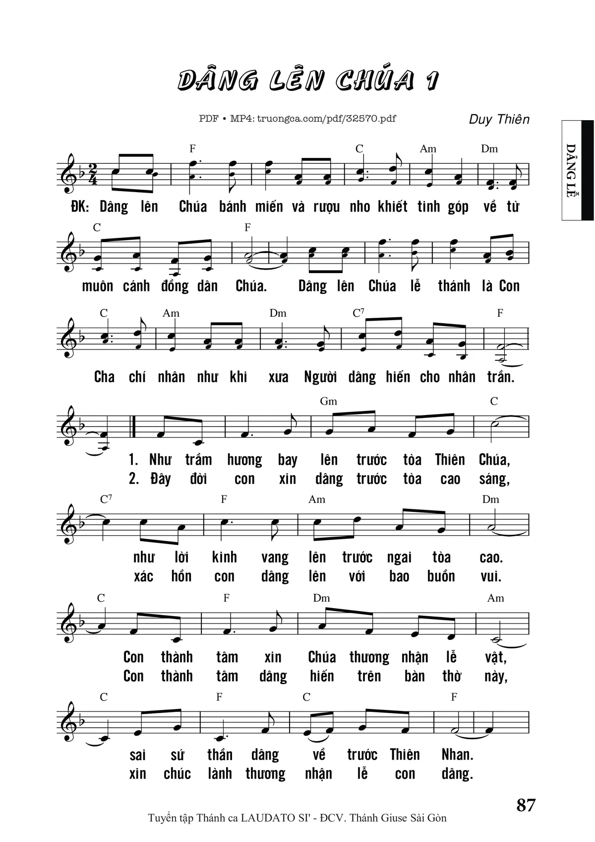 Sheet nhạc có nốt Dâng Lên Chúa 1 của nhạc sĩ Duy Thiên và file PDF nốt nhạc đăng lên đây nhằm giúp các bạn xướng âm cho đúng nốt và hát thêm hay, chỉ mang tính chất tham khảo, không có mục đích thương mại. Bản quyền thuộc về tác giả và tổ chức nắm bản quyền, Truongca.com không giữ bất kỳ bản quyền của nội dung nào cả. Các bạn có thể tải về bản PDF chất lượng cao, gồm khuông nhạc có nốt với đường link file PDF bên trên.