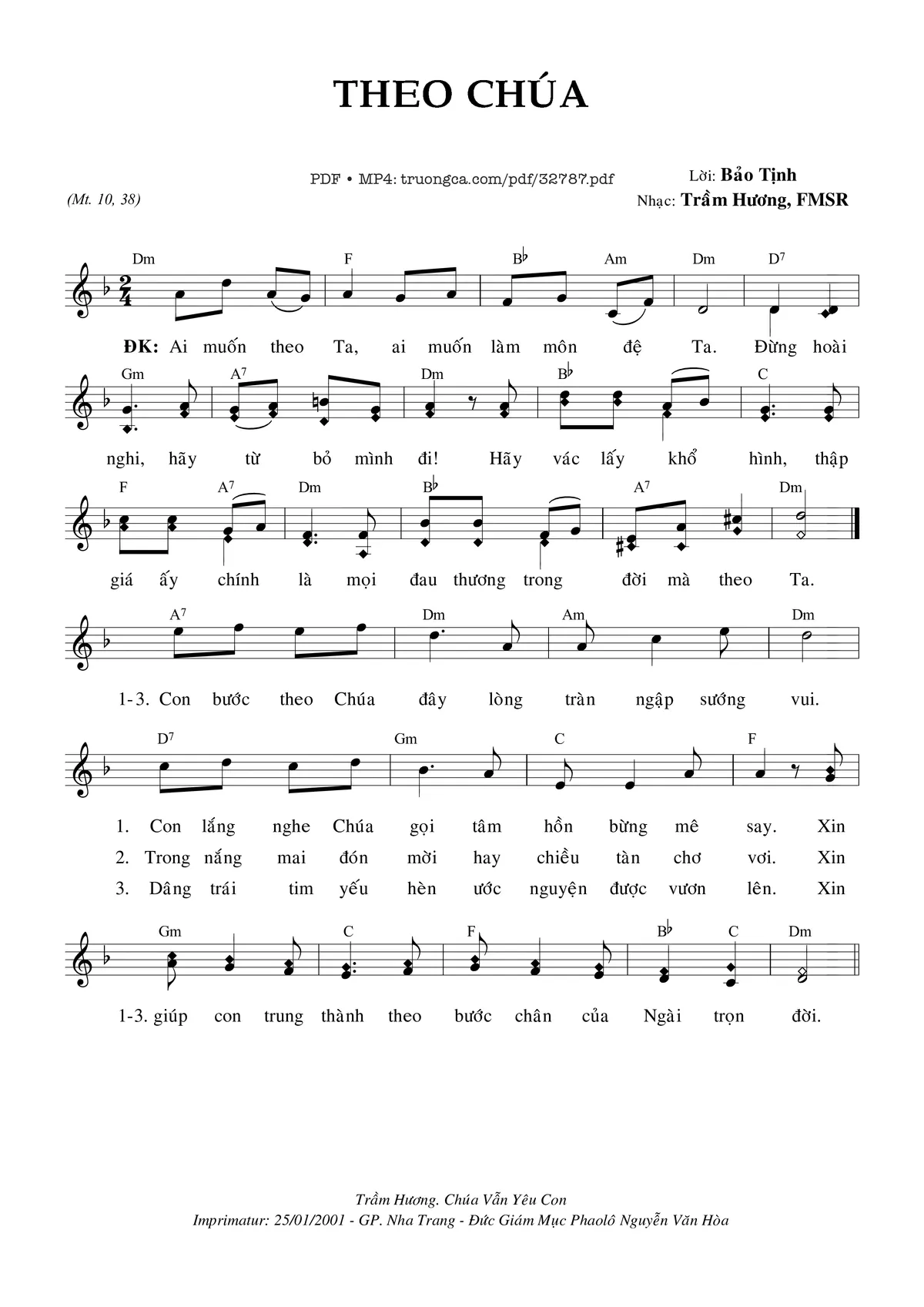 1) Con bước theo Chúa đây lòng tràn ngập sướng vui. Con lắng nghe Chúa gọi tâm hồn bừng mê say. Xin giúp con trung thành theo bước chân của Ngài trọn đời.