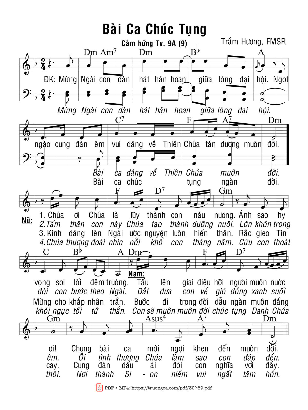 Sheet nhạc có nốt Bài Ca Chúc Tụng của nhạc sĩ Trầm Hương và file PDF nốt nhạc đăng lên đây nhằm giúp các bạn xướng âm cho đúng nốt và hát thêm hay, chỉ mang tính chất tham khảo, không có mục đích thương mại. Bản quyền thuộc về tác giả và tổ chức nắm bản quyền, Truongca.com không giữ bất kỳ bản quyền của nội dung nào cả. Các bạn có thể tải về bản PDF chất lượng cao, gồm khuông nhạc có nốt với đường link file PDF bên trên.