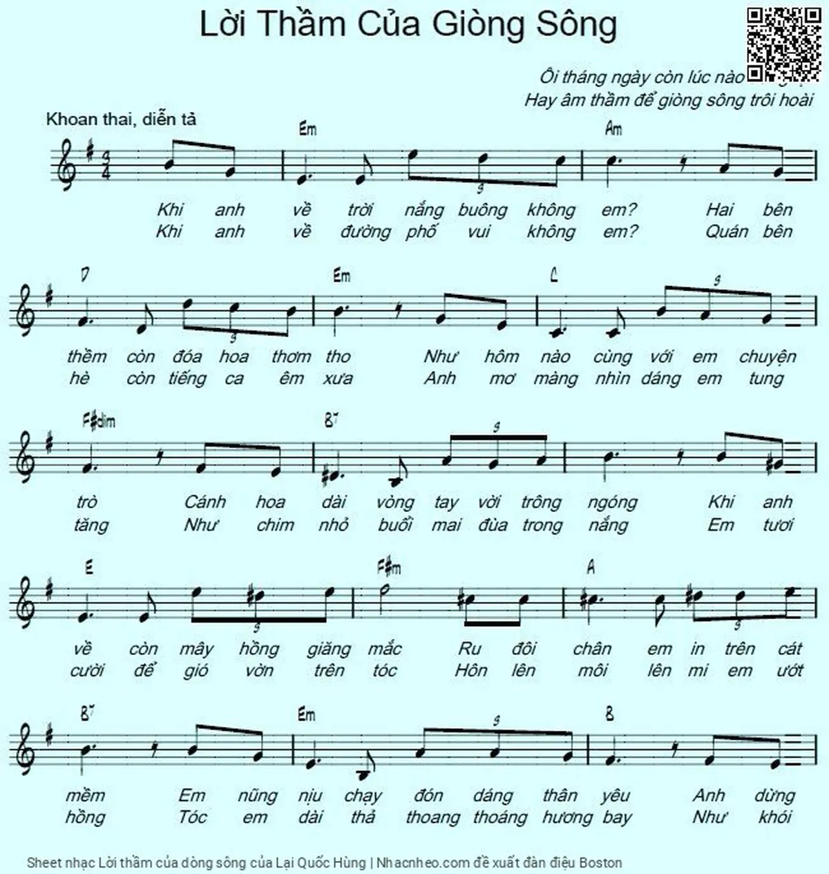 Phần nghe hát Lời thầm của dòng sông (Lại Quốc Hùng) được nhúng từ Youtube, Musescore hoặc link ngoài và chịu sự kiểm soát bản quyền của bên thứ ba đó, vì vậy có thể bị xóa hoặc chèn quảng cáo bất kỳ lúc nào. Nếu bạn không nghe - xem được ca sĩ hát tức là đã bị Youtube hoặc Musescore kiểm soát.