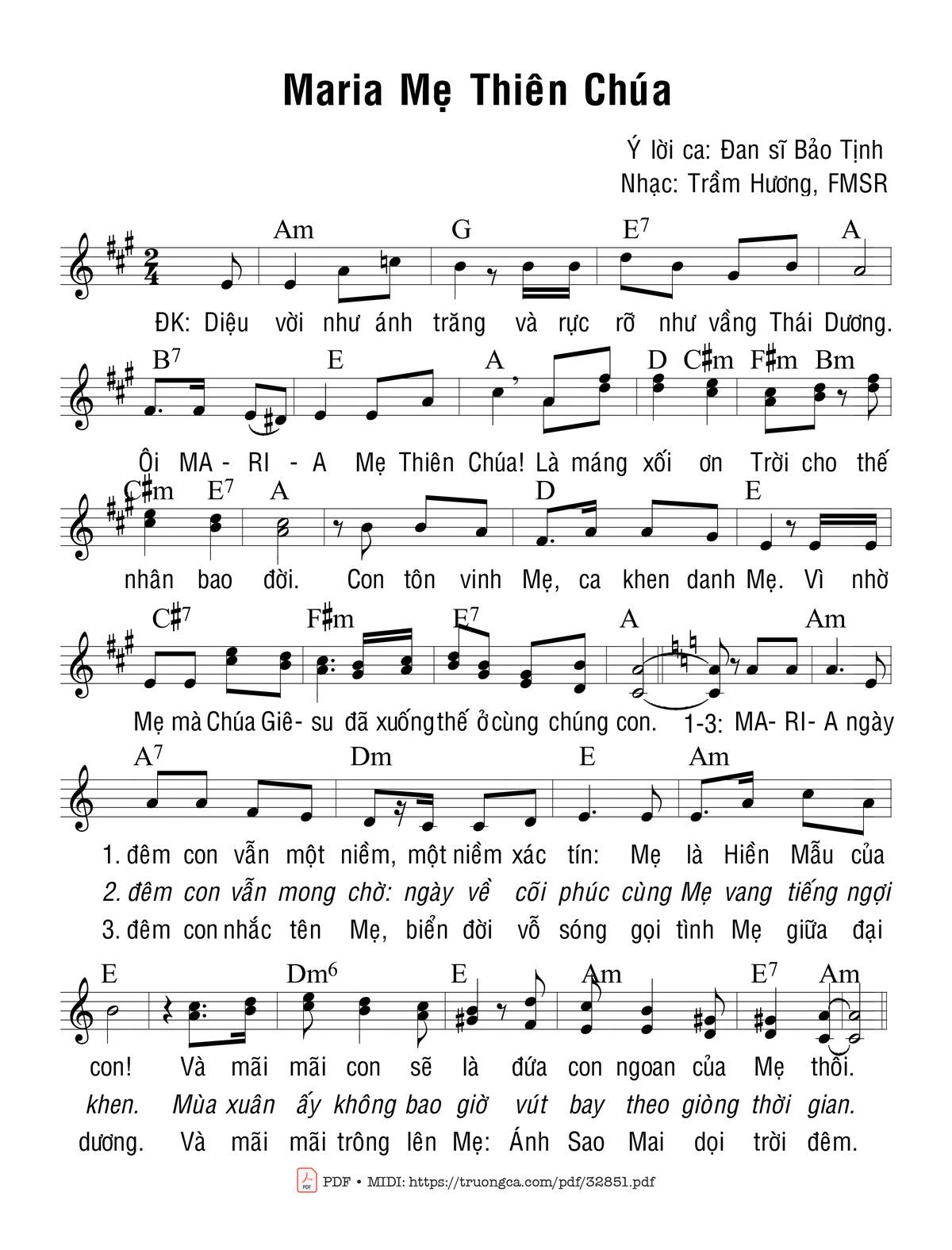 Sheet nhạc có nốt Maria Mẹ Thiên Chúa của nhạc sĩ Trầm Hương và file PDF nốt nhạc đăng lên đây nhằm giúp các bạn xướng âm cho đúng nốt và hát thêm hay, chỉ mang tính chất tham khảo, không có mục đích thương mại. Bản quyền thuộc về tác giả và tổ chức nắm bản quyền, Truongca.com không giữ bất kỳ bản quyền của nội dung nào cả. Các bạn có thể tải về bản PDF chất lượng cao, gồm khuông nhạc có nốt với đường link file PDF bên trên.