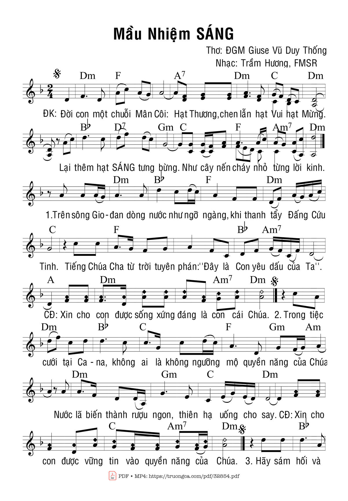 Sheet nhạc có nốt Mầu Nhiệm Sáng của nhạc sĩ Trầm Hương và file PDF nốt nhạc đăng lên đây nhằm giúp các bạn xướng âm cho đúng nốt và hát thêm hay, chỉ mang tính chất tham khảo, không có mục đích thương mại. Bản quyền thuộc về tác giả và tổ chức nắm bản quyền, Truongca.com không giữ bất kỳ bản quyền của nội dung nào cả. Các bạn có thể tải về bản PDF chất lượng cao, gồm khuông nhạc có nốt với đường link file PDF bên trên.