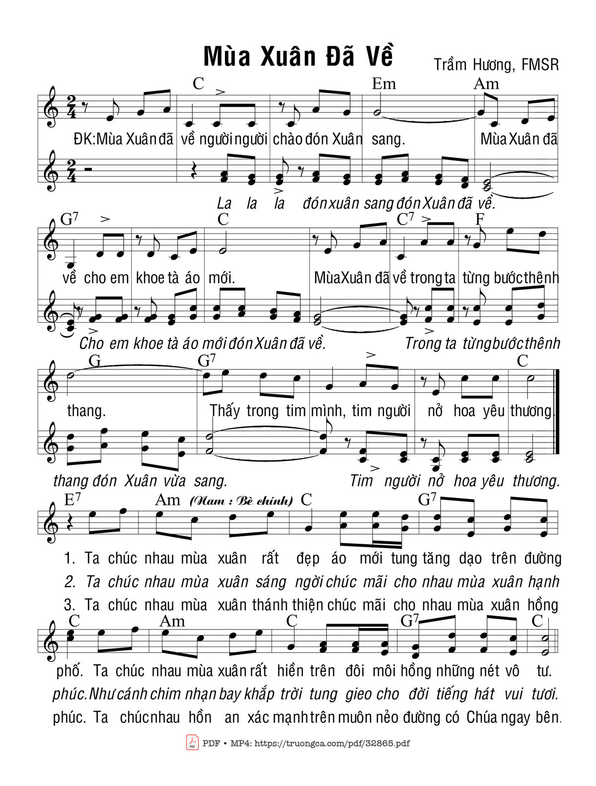 Sheet nhạc có nốt Mùa Xuân Đã Về của nhạc sĩ Trầm Hương và file PDF nốt nhạc đăng lên đây nhằm giúp các bạn xướng âm cho đúng nốt và hát thêm hay, chỉ mang tính chất tham khảo, không có mục đích thương mại. Bản quyền thuộc về tác giả và tổ chức nắm bản quyền, Truongca.com không giữ bất kỳ bản quyền của nội dung nào cả. Các bạn có thể tải về bản PDF chất lượng cao, gồm khuông nhạc có nốt với đường link file PDF bên trên.