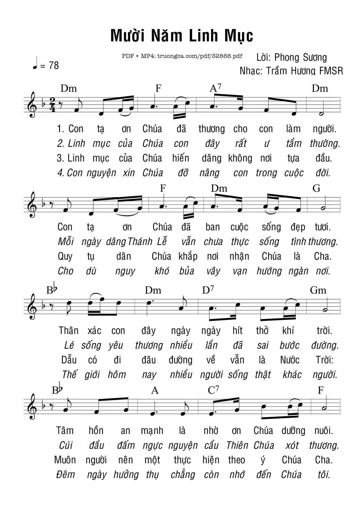 Sheet nhạc có nốt Mười Năm Linh Mục của nhạc sĩ Trầm Hương và file PDF nốt nhạc đăng lên đây nhằm giúp các bạn xướng âm cho đúng nốt và hát thêm hay, chỉ mang tính chất tham khảo, không có mục đích thương mại. Bản quyền thuộc về tác giả và tổ chức nắm bản quyền, Truongca.com không giữ bất kỳ bản quyền của nội dung nào cả. Các bạn có thể tải về bản PDF chất lượng cao, gồm khuông nhạc có nốt với đường link file PDF bên trên.