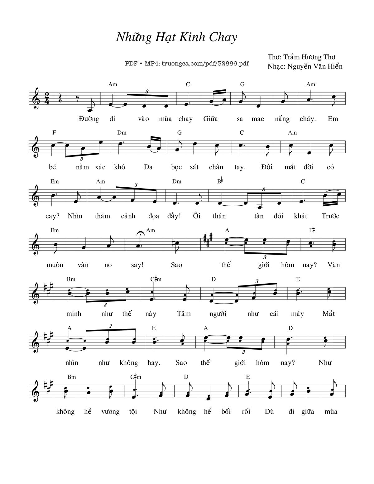 Sheet nhạc có nốt Những Hạt Kinh Chay của nhạc sĩ Trầm Hương và file PDF nốt nhạc đăng lên đây nhằm giúp các bạn xướng âm cho đúng nốt và hát thêm hay, chỉ mang tính chất tham khảo, không có mục đích thương mại. Bản quyền thuộc về tác giả và tổ chức nắm bản quyền, Truongca.com không giữ bất kỳ bản quyền của nội dung nào cả. Các bạn có thể tải về bản PDF chất lượng cao, gồm khuông nhạc có nốt với đường link file PDF bên trên.
