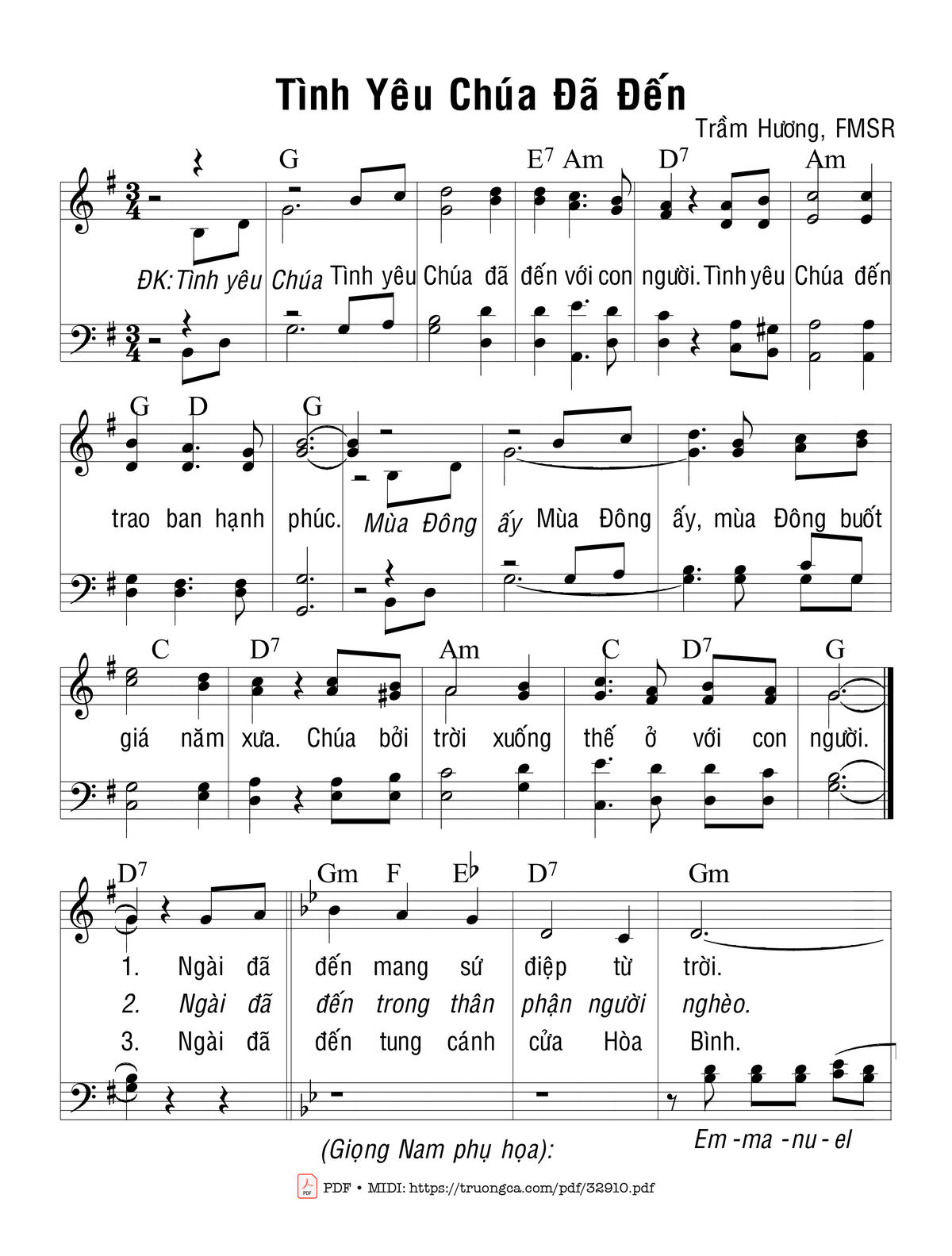 Sheet nhạc có nốt Tình Yêu Chúa Đã Đến của nhạc sĩ Trầm Hương và file PDF nốt nhạc đăng lên đây nhằm giúp các bạn xướng âm cho đúng nốt và hát thêm hay, chỉ mang tính chất tham khảo, không có mục đích thương mại. Bản quyền thuộc về tác giả và tổ chức nắm bản quyền, Truongca.com không giữ bất kỳ bản quyền của nội dung nào cả. Các bạn có thể tải về bản PDF chất lượng cao, gồm khuông nhạc có nốt với đường link file PDF bên trên.