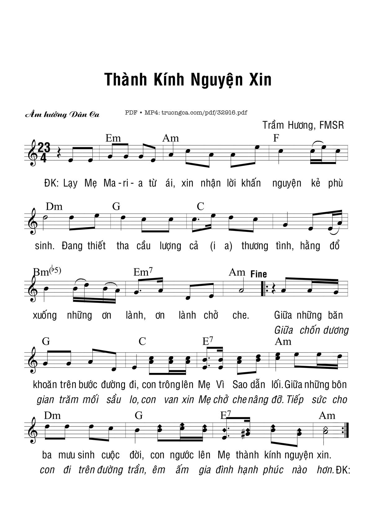 Sheet nhạc có nốt Thành Kính Nguyện Xin của nhạc sĩ Trầm Hương và file PDF nốt nhạc đăng lên đây nhằm giúp các bạn xướng âm cho đúng nốt và hát thêm hay, chỉ mang tính chất tham khảo, không có mục đích thương mại. Bản quyền thuộc về tác giả và tổ chức nắm bản quyền, Truongca.com không giữ bất kỳ bản quyền của nội dung nào cả. Các bạn có thể tải về bản PDF chất lượng cao, gồm khuông nhạc có nốt với đường link file PDF bên trên.