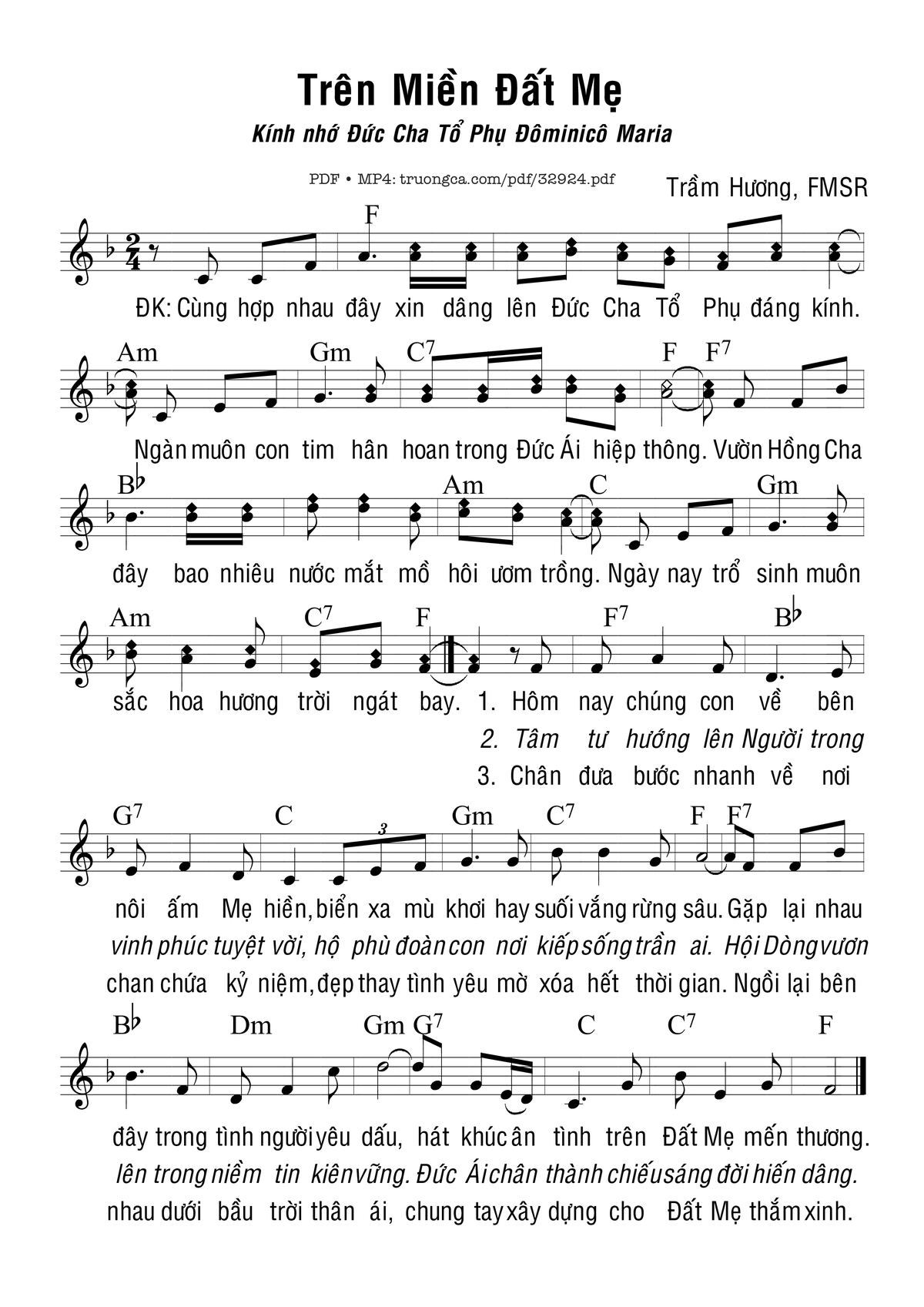 Sheet nhạc có nốt Trên Miền Đất Mẹ của nhạc sĩ Trầm Hương và file PDF nốt nhạc đăng lên đây nhằm giúp các bạn xướng âm cho đúng nốt và hát thêm hay, chỉ mang tính chất tham khảo, không có mục đích thương mại. Bản quyền thuộc về tác giả và tổ chức nắm bản quyền, Truongca.com không giữ bất kỳ bản quyền của nội dung nào cả. Các bạn có thể tải về bản PDF chất lượng cao, gồm khuông nhạc có nốt với đường link file PDF bên trên.