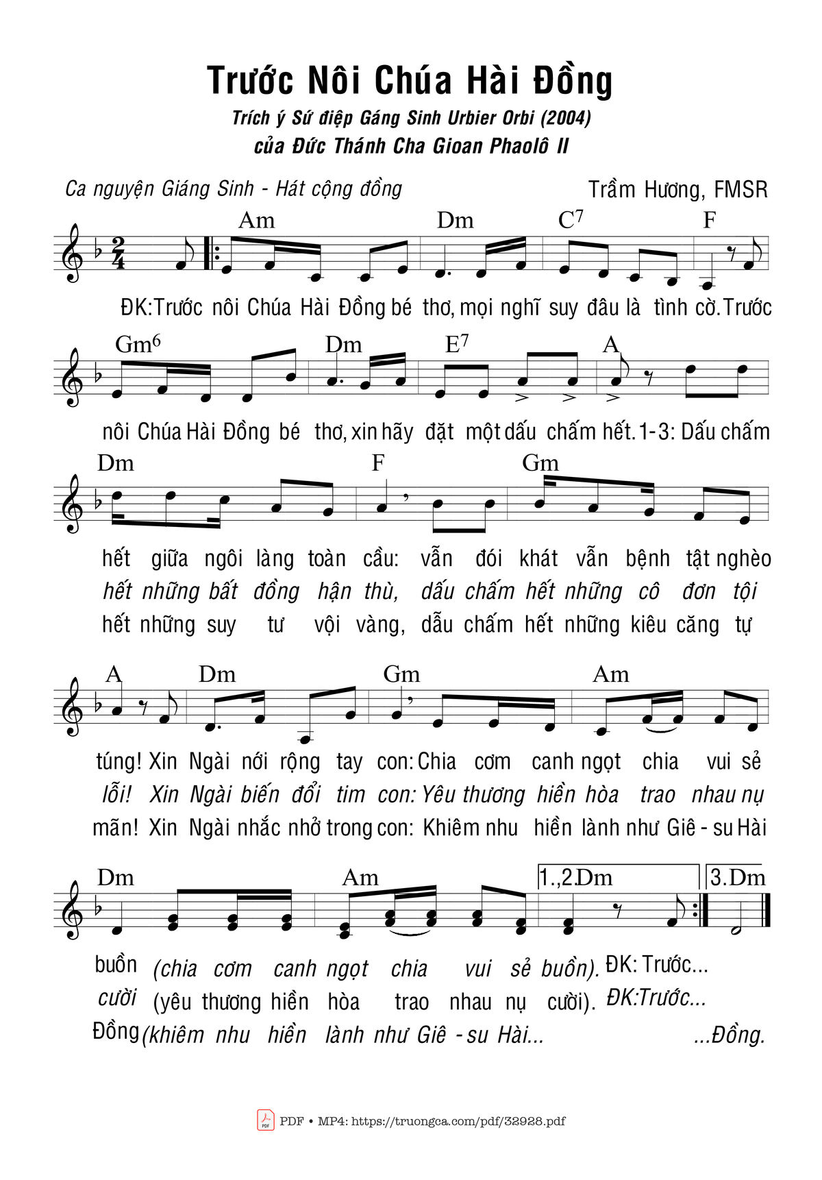 Sheet nhạc có nốt Trước Nôi Chúa Hài Đồng của nhạc sĩ Trầm Hương và file PDF nốt nhạc đăng lên đây nhằm giúp các bạn xướng âm cho đúng nốt và hát thêm hay, chỉ mang tính chất tham khảo, không có mục đích thương mại. Bản quyền thuộc về tác giả và tổ chức nắm bản quyền, Truongca.com không giữ bất kỳ bản quyền của nội dung nào cả. Các bạn có thể tải về bản PDF chất lượng cao, gồm khuông nhạc có nốt với đường link file PDF bên trên.