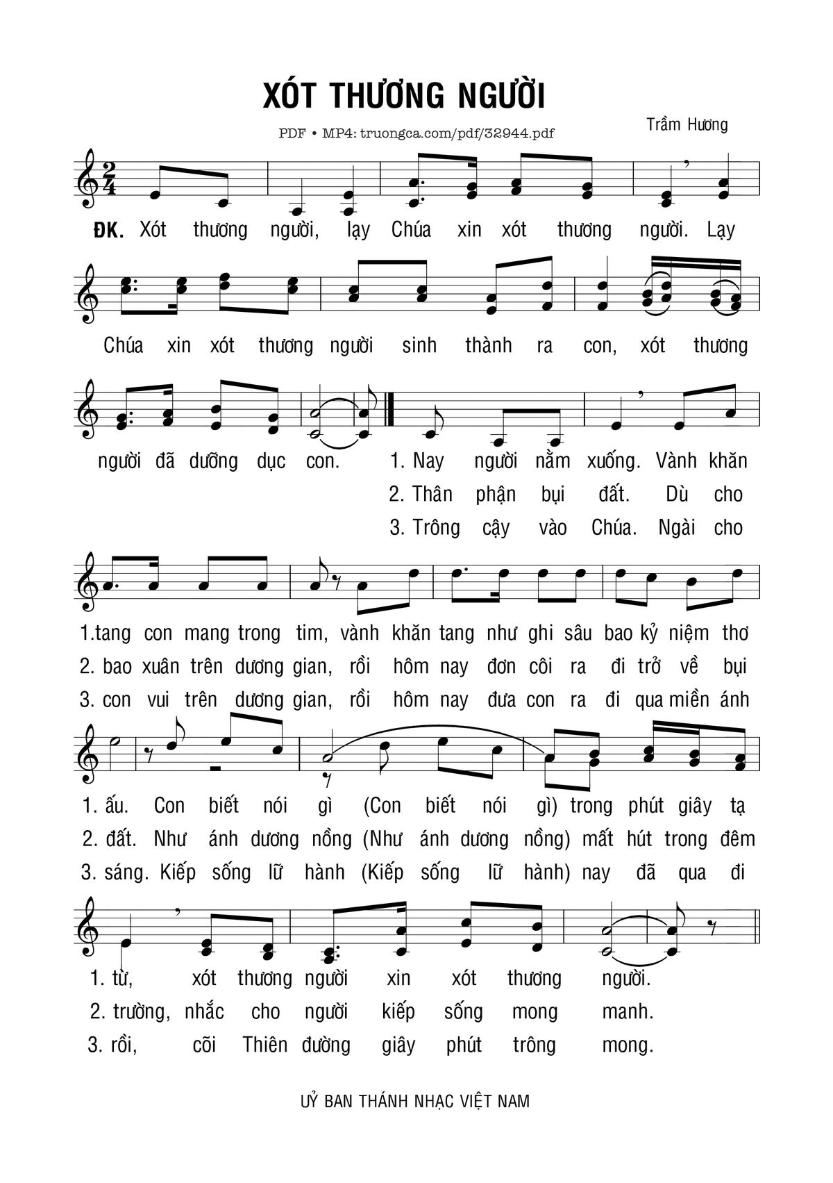 Sheet nhạc có nốt Xót Thương Người của nhạc sĩ Trầm Hương và file PDF nốt nhạc đăng lên đây nhằm giúp các bạn xướng âm cho đúng nốt và hát thêm hay, chỉ mang tính chất tham khảo, không có mục đích thương mại. Bản quyền thuộc về tác giả và tổ chức nắm bản quyền, Truongca.com không giữ bất kỳ bản quyền của nội dung nào cả. Các bạn có thể tải về bản PDF chất lượng cao, gồm khuông nhạc có nốt với đường link file PDF bên trên.