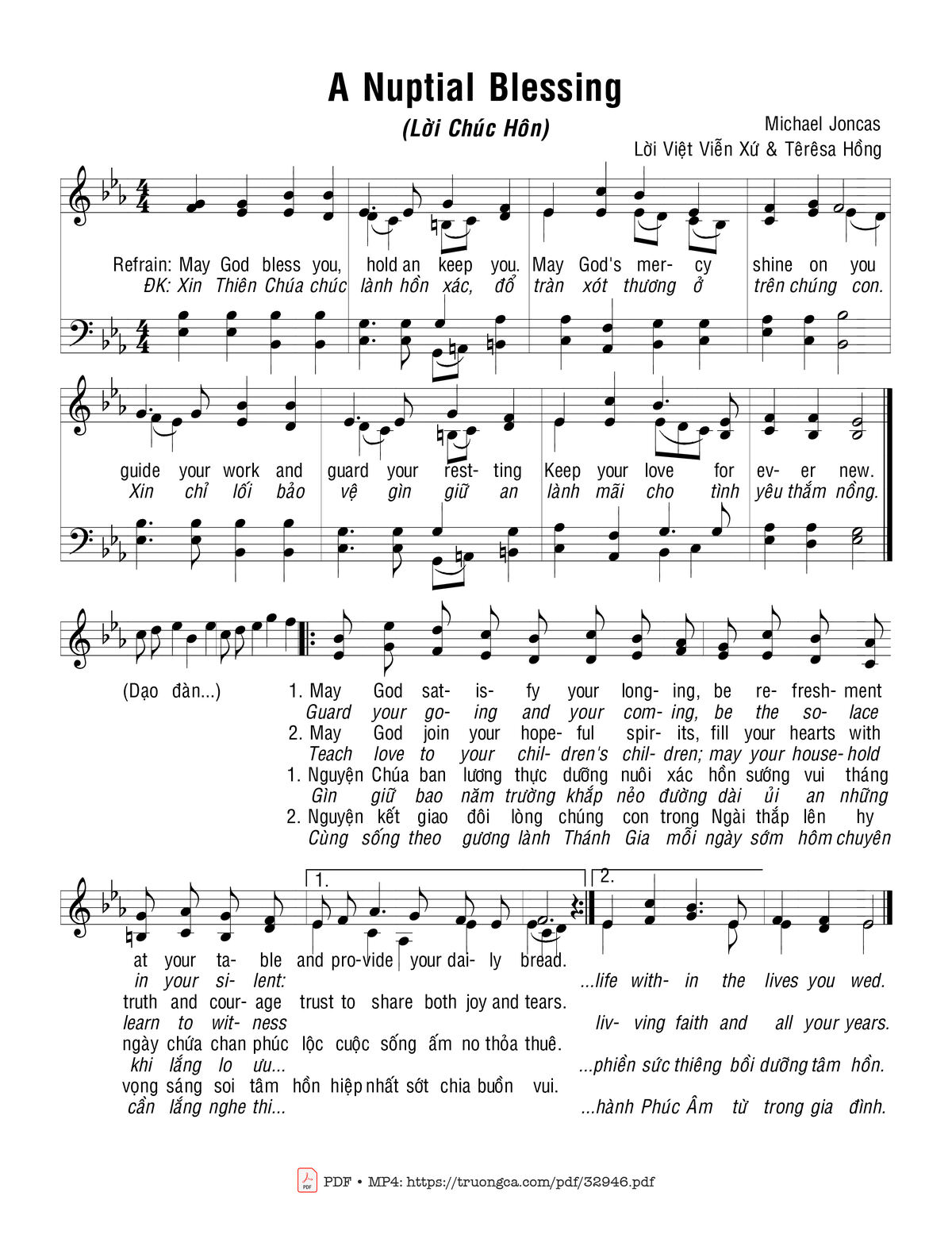Sheet nhạc có nốt A Nuptial Bles8Sing (Lời Chúc Hôn) của nhạc sĩ Viễn Xứ và file PDF nốt nhạc đăng lên đây nhằm giúp các bạn xướng âm cho đúng nốt và hát thêm hay, chỉ mang tính chất tham khảo, không có mục đích thương mại. Bản quyền thuộc về tác giả và tổ chức nắm bản quyền, Truongca.com không giữ bất kỳ bản quyền của nội dung nào cả. Các bạn có thể tải về bản PDF chất lượng cao, gồm khuông nhạc có nốt với đường link file PDF bên trên.