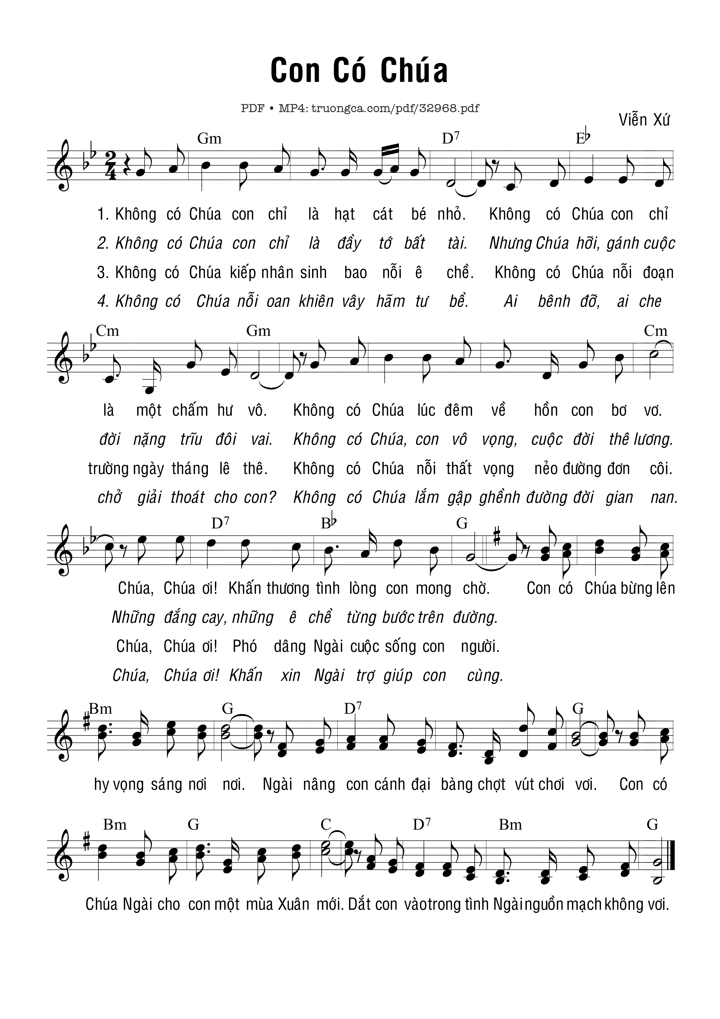 Sheet nhạc có nốt Con Có Chúa của nhạc sĩ Viễn Xứ và file PDF nốt nhạc đăng lên đây nhằm giúp các bạn xướng âm cho đúng nốt và hát thêm hay, chỉ mang tính chất tham khảo, không có mục đích thương mại. Bản quyền thuộc về tác giả và tổ chức nắm bản quyền, Truongca.com không giữ bất kỳ bản quyền của nội dung nào cả. Các bạn có thể tải về bản PDF chất lượng cao, gồm khuông nhạc có nốt với đường link file PDF bên trên.