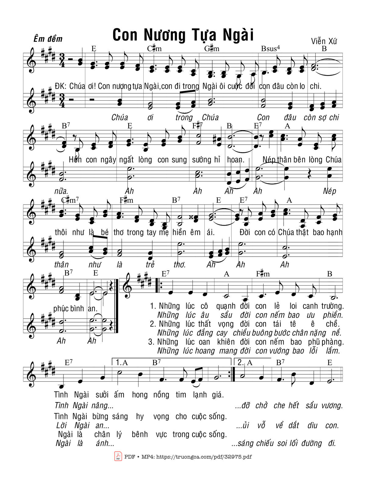 Sheet nhạc có nốt Con Nương Tựa Ngài (4 Bè) của nhạc sĩ Viễn Xứ và file PDF nốt nhạc đăng lên đây nhằm giúp các bạn xướng âm cho đúng nốt và hát thêm hay, chỉ mang tính chất tham khảo, không có mục đích thương mại. Bản quyền thuộc về tác giả và tổ chức nắm bản quyền, Truongca.com không giữ bất kỳ bản quyền của nội dung nào cả. Các bạn có thể tải về bản PDF chất lượng cao, gồm khuông nhạc có nốt với đường link file PDF bên trên.