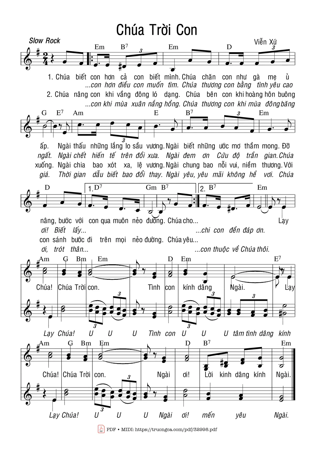 Sheet nhạc có nốt Chúa Trời Con (4 Bè) của nhạc sĩ Viễn Xứ và file PDF nốt nhạc đăng lên đây nhằm giúp các bạn xướng âm cho đúng nốt và hát thêm hay, chỉ mang tính chất tham khảo, không có mục đích thương mại. Bản quyền thuộc về tác giả và tổ chức nắm bản quyền, Truongca.com không giữ bất kỳ bản quyền của nội dung nào cả. Các bạn có thể tải về bản PDF chất lượng cao, gồm khuông nhạc có nốt với đường link file PDF bên trên.