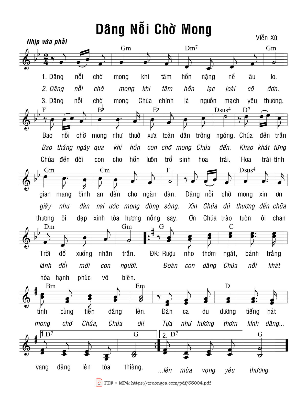 Sheet nhạc có nốt Dâng Nỗi Chờ Mong của nhạc sĩ Viễn Xứ và file PDF nốt nhạc đăng lên đây nhằm giúp các bạn xướng âm cho đúng nốt và hát thêm hay, chỉ mang tính chất tham khảo, không có mục đích thương mại. Bản quyền thuộc về tác giả và tổ chức nắm bản quyền, Truongca.com không giữ bất kỳ bản quyền của nội dung nào cả. Các bạn có thể tải về bản PDF chất lượng cao, gồm khuông nhạc có nốt với đường link file PDF bên trên.