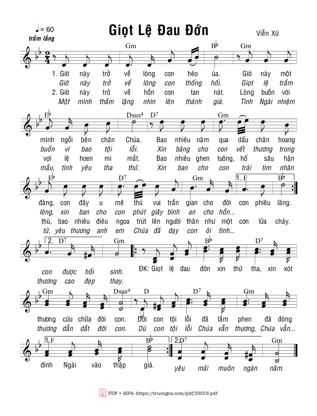 Sheet nhạc có nốt Giọt Lệ Đau Đớn của nhạc sĩ Viễn Xứ và file PDF nốt nhạc đăng lên đây nhằm giúp các bạn xướng âm cho đúng nốt và hát thêm hay, chỉ mang tính chất tham khảo, không có mục đích thương mại. Bản quyền thuộc về tác giả và tổ chức nắm bản quyền, Truongca.com không giữ bất kỳ bản quyền của nội dung nào cả. Các bạn có thể tải về bản PDF chất lượng cao, gồm khuông nhạc có nốt với đường link file PDF bên trên.