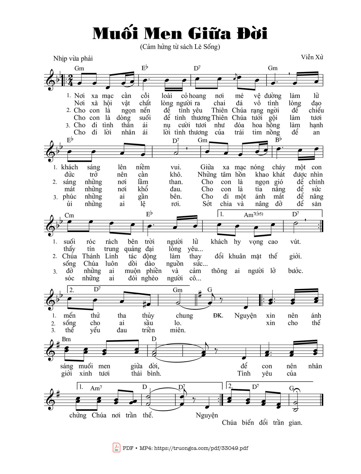 Sheet nhạc có nốt Muối Men Giữa Đời của nhạc sĩ Viễn Xứ và file PDF nốt nhạc đăng lên đây nhằm giúp các bạn xướng âm cho đúng nốt và hát thêm hay, chỉ mang tính chất tham khảo, không có mục đích thương mại. Bản quyền thuộc về tác giả và tổ chức nắm bản quyền, Truongca.com không giữ bất kỳ bản quyền của nội dung nào cả. Các bạn có thể tải về bản PDF chất lượng cao, gồm khuông nhạc có nốt với đường link file PDF bên trên.