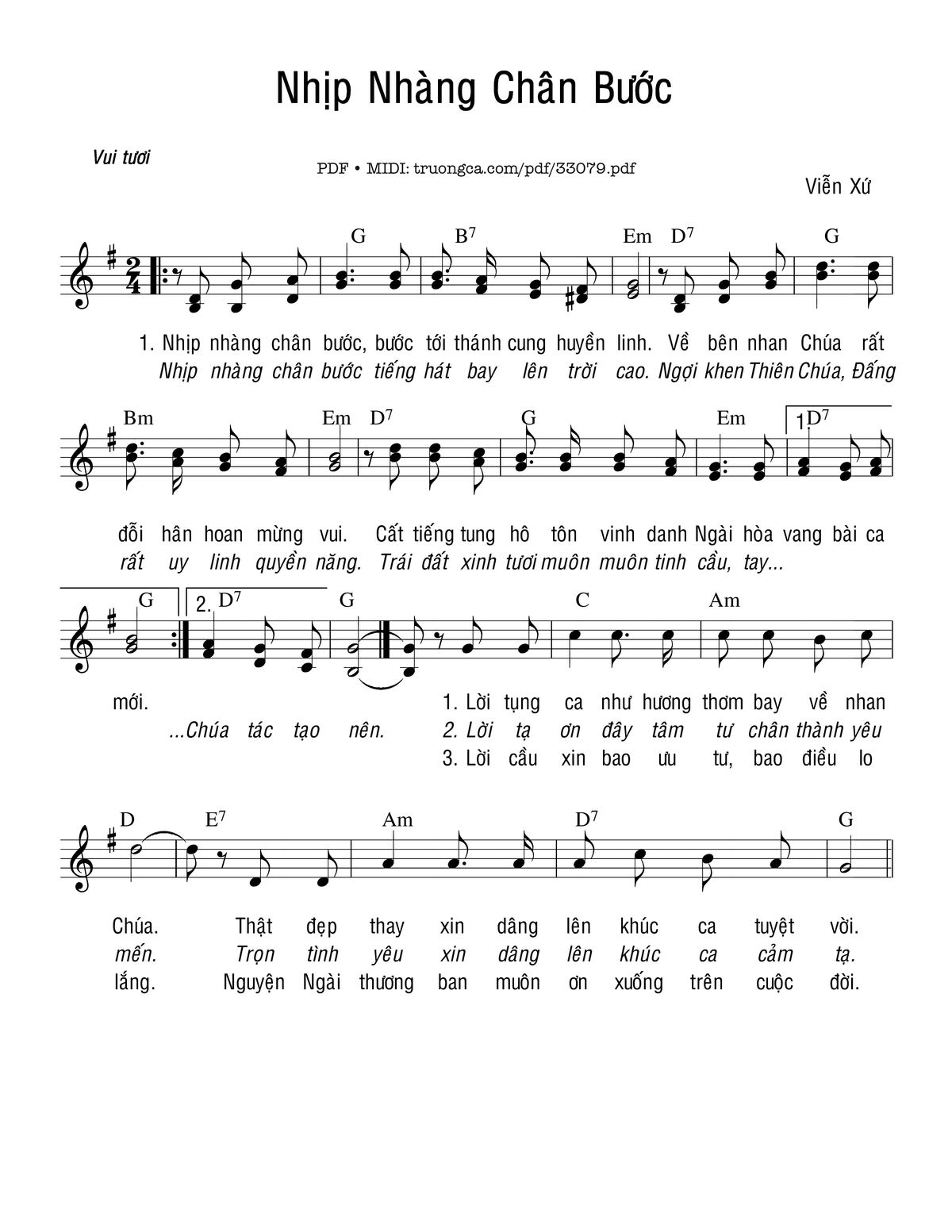Sheet nhạc có nốt Nhịp Nhàng Chân Bước của nhạc sĩ Viễn Xứ và file PDF nốt nhạc đăng lên đây nhằm giúp các bạn xướng âm cho đúng nốt và hát thêm hay, chỉ mang tính chất tham khảo, không có mục đích thương mại. Bản quyền thuộc về tác giả và tổ chức nắm bản quyền, Truongca.com không giữ bất kỳ bản quyền của nội dung nào cả. Các bạn có thể tải về bản PDF chất lượng cao, gồm khuông nhạc có nốt với đường link file PDF bên trên.