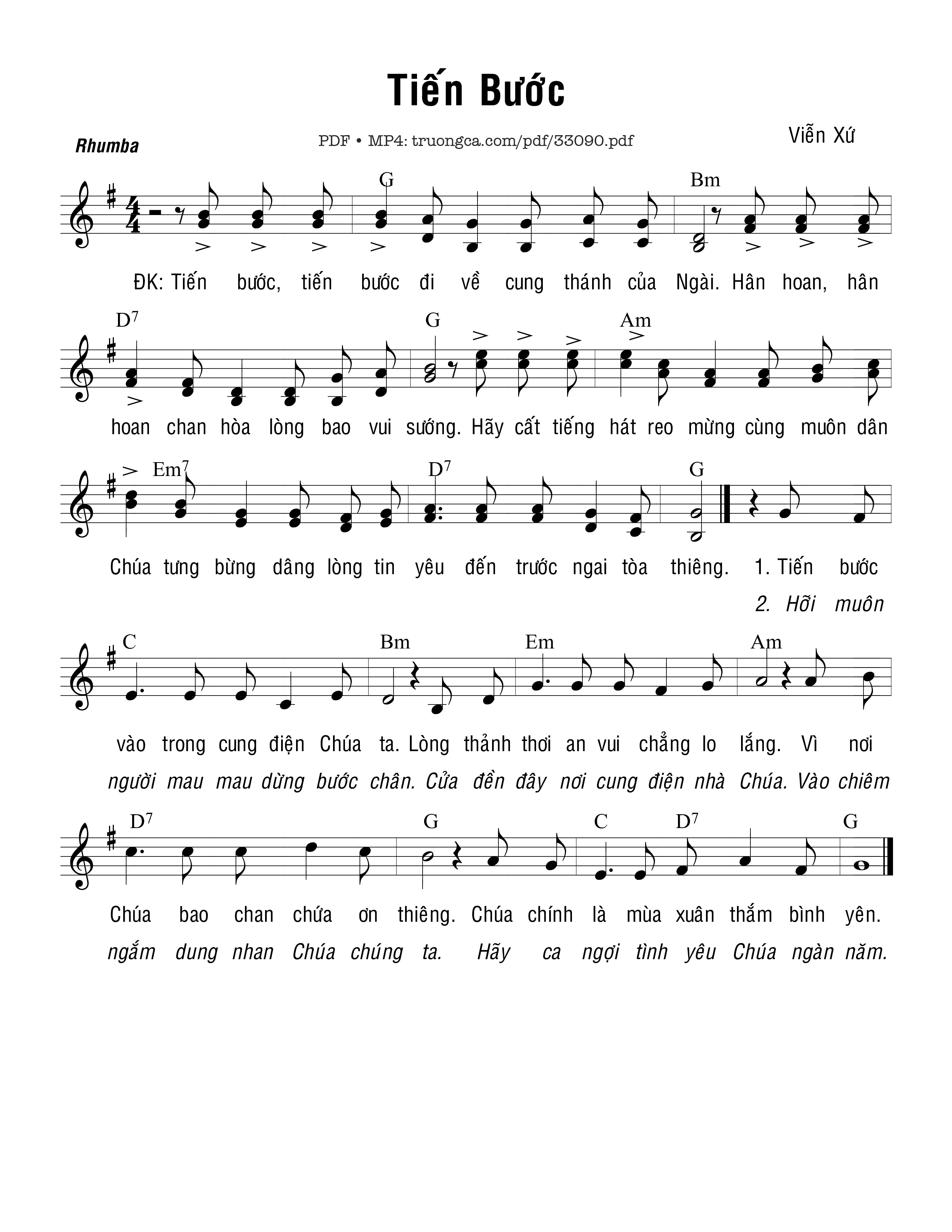 Sheet nhạc có nốt Tiến Bước của nhạc sĩ Viễn Xứ và file PDF nốt nhạc đăng lên đây nhằm giúp các bạn xướng âm cho đúng nốt và hát thêm hay, chỉ mang tính chất tham khảo, không có mục đích thương mại. Bản quyền thuộc về tác giả và tổ chức nắm bản quyền, Truongca.com không giữ bất kỳ bản quyền của nội dung nào cả. Các bạn có thể tải về bản PDF chất lượng cao, gồm khuông nhạc có nốt với đường link file PDF bên trên.