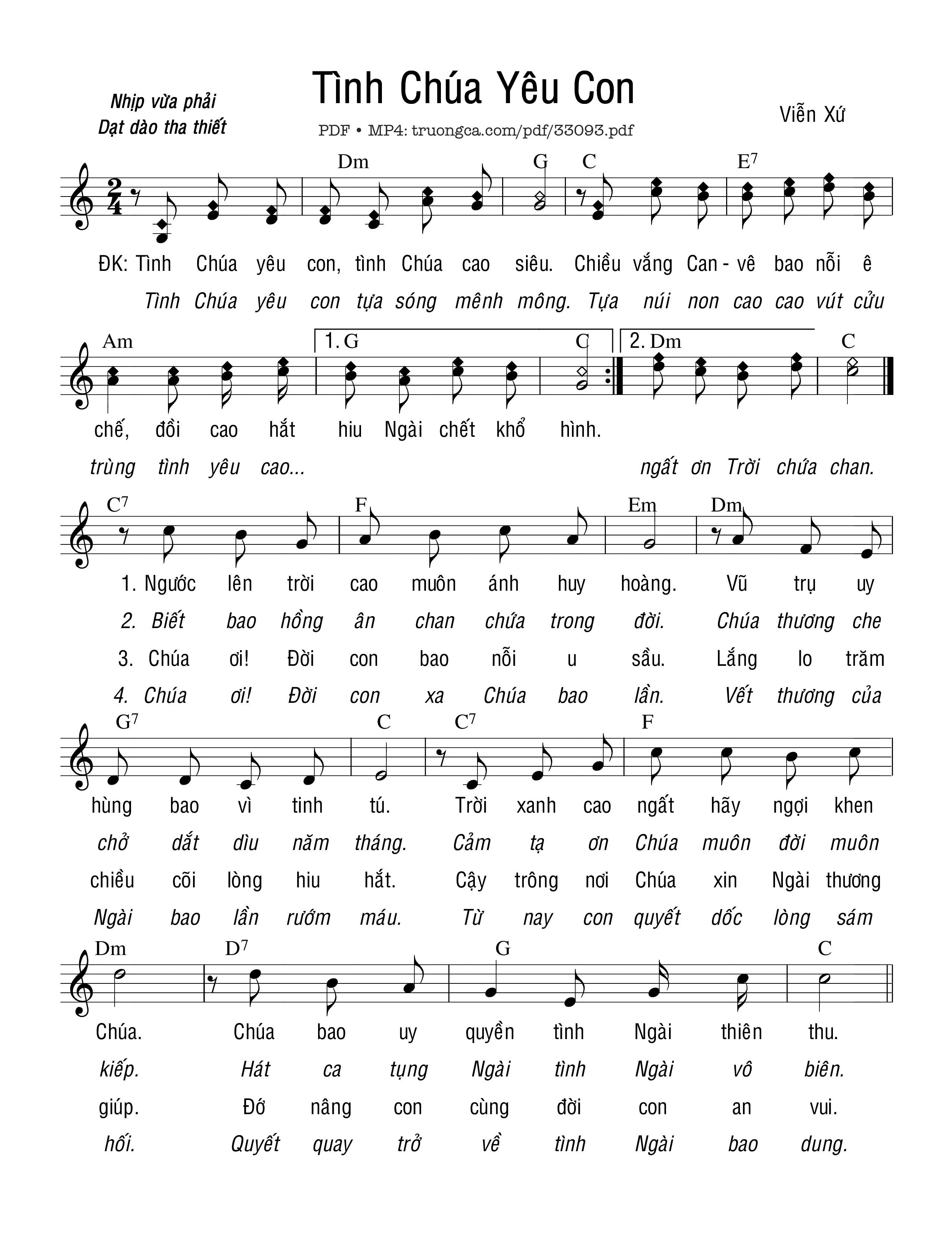 Sheet nhạc có nốt Tình Chúa Yêu Con của nhạc sĩ Viễn Xứ và file PDF nốt nhạc đăng lên đây nhằm giúp các bạn xướng âm cho đúng nốt và hát thêm hay, chỉ mang tính chất tham khảo, không có mục đích thương mại. Bản quyền thuộc về tác giả và tổ chức nắm bản quyền, Truongca.com không giữ bất kỳ bản quyền của nội dung nào cả. Các bạn có thể tải về bản PDF chất lượng cao, gồm khuông nhạc có nốt với đường link file PDF bên trên.