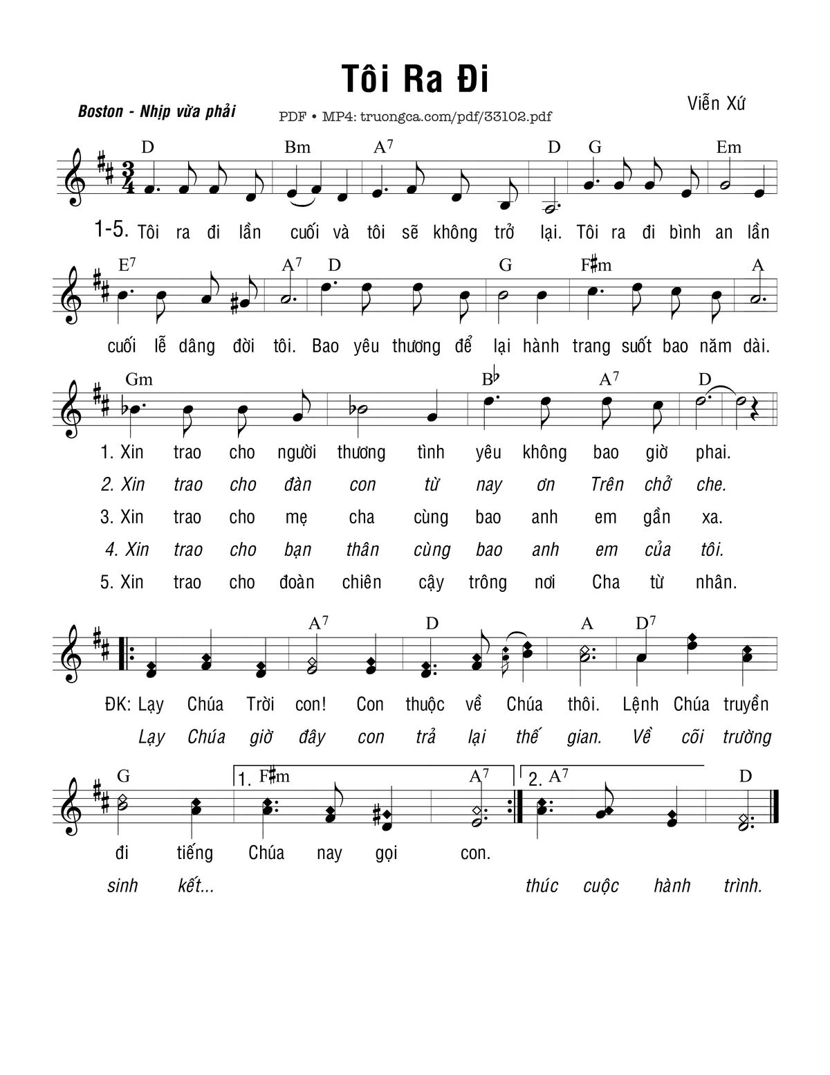 Sheet nhạc có nốt Tôi Ra Đi của nhạc sĩ Viễn Xứ và file PDF nốt nhạc đăng lên đây nhằm giúp các bạn xướng âm cho đúng nốt và hát thêm hay, chỉ mang tính chất tham khảo, không có mục đích thương mại. Bản quyền thuộc về tác giả và tổ chức nắm bản quyền, Truongca.com không giữ bất kỳ bản quyền của nội dung nào cả. Các bạn có thể tải về bản PDF chất lượng cao, gồm khuông nhạc có nốt với đường link file PDF bên trên.