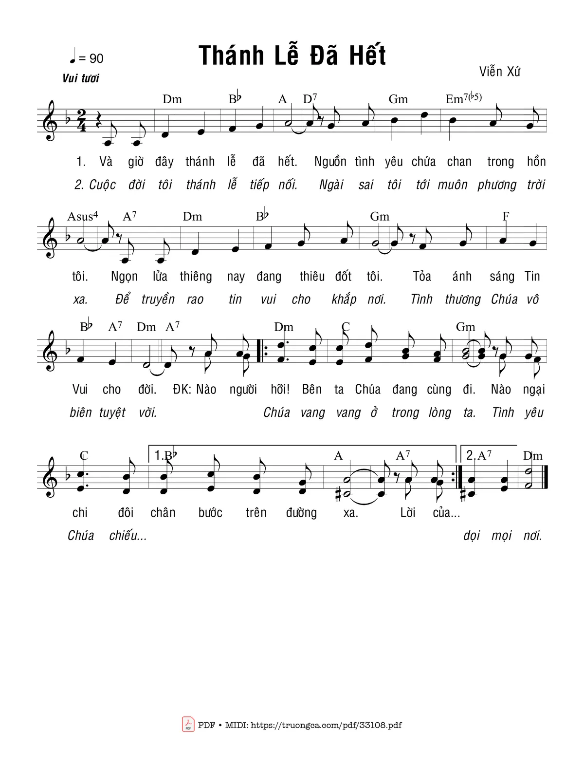 Sheet nhạc có nốt Thánh Lễ Đã Hết của nhạc sĩ Viễn Xứ và file PDF nốt nhạc đăng lên đây nhằm giúp các bạn xướng âm cho đúng nốt và hát thêm hay, chỉ mang tính chất tham khảo, không có mục đích thương mại. Bản quyền thuộc về tác giả và tổ chức nắm bản quyền, Truongca.com không giữ bất kỳ bản quyền của nội dung nào cả. Các bạn có thể tải về bản PDF chất lượng cao, gồm khuông nhạc có nốt với đường link file PDF bên trên.