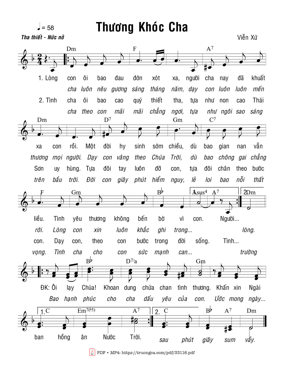 Sheet nhạc có nốt Thương Khóc Cha của nhạc sĩ Viễn Xứ và file PDF nốt nhạc đăng lên đây nhằm giúp các bạn xướng âm cho đúng nốt và hát thêm hay, chỉ mang tính chất tham khảo, không có mục đích thương mại. Bản quyền thuộc về tác giả và tổ chức nắm bản quyền, Truongca.com không giữ bất kỳ bản quyền của nội dung nào cả. Các bạn có thể tải về bản PDF chất lượng cao, gồm khuông nhạc có nốt với đường link file PDF bên trên.