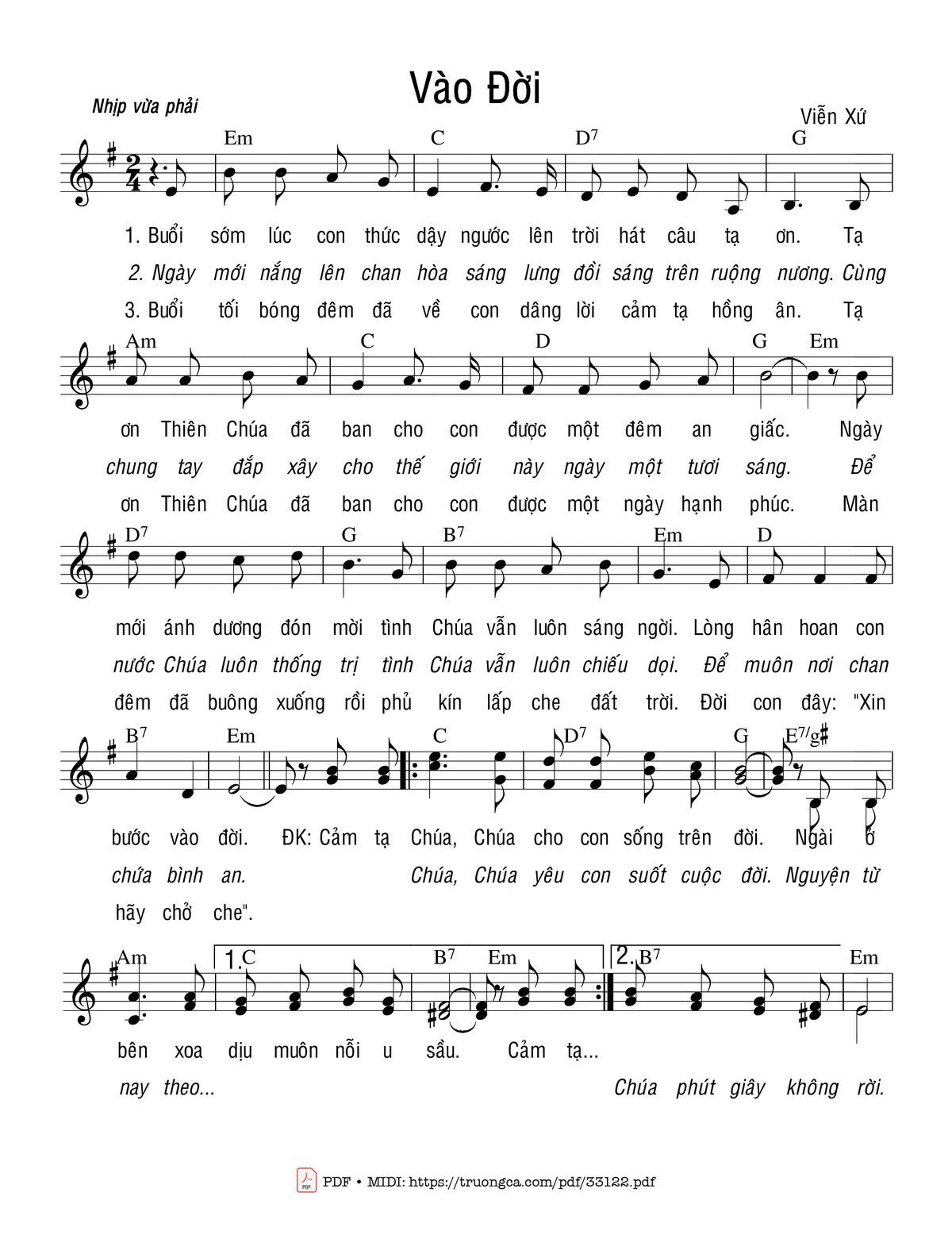 Sheet nhạc có nốt Vào Đời của nhạc sĩ Viễn Xứ và file PDF nốt nhạc đăng lên đây nhằm giúp các bạn xướng âm cho đúng nốt và hát thêm hay, chỉ mang tính chất tham khảo, không có mục đích thương mại. Bản quyền thuộc về tác giả và tổ chức nắm bản quyền, Truongca.com không giữ bất kỳ bản quyền của nội dung nào cả. Các bạn có thể tải về bản PDF chất lượng cao, gồm khuông nhạc có nốt với đường link file PDF bên trên.