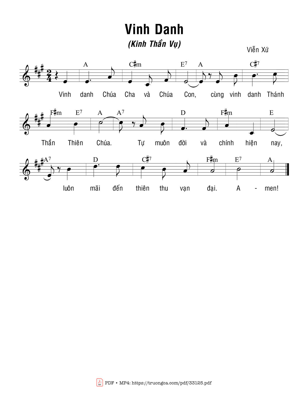 Sheet nhạc có nốt Vinh Danh của nhạc sĩ Viễn Xứ và file PDF nốt nhạc đăng lên đây nhằm giúp các bạn xướng âm cho đúng nốt và hát thêm hay, chỉ mang tính chất tham khảo, không có mục đích thương mại. Bản quyền thuộc về tác giả và tổ chức nắm bản quyền, Truongca.com không giữ bất kỳ bản quyền của nội dung nào cả. Các bạn có thể tải về bản PDF chất lượng cao, gồm khuông nhạc có nốt với đường link file PDF bên trên.