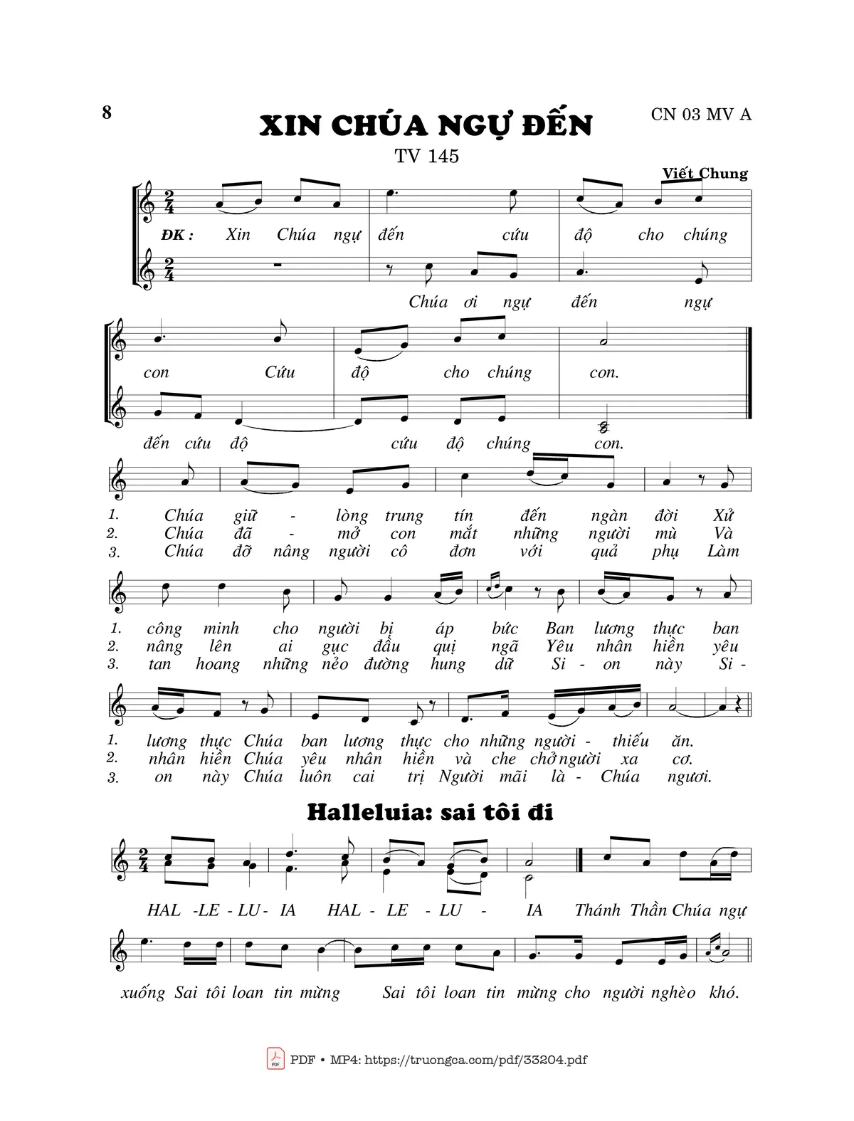 Sheet nhạc có nốt Thánh Vịnh 145, Xin Chúa Ngự Đến của nhạc sĩ Viết Chung và file PDF nốt nhạc đăng lên đây nhằm giúp các bạn xướng âm cho đúng nốt và hát thêm hay, chỉ mang tính chất tham khảo, không có mục đích thương mại. Bản quyền thuộc về tác giả và tổ chức nắm bản quyền, Truongca.com không giữ bất kỳ bản quyền của nội dung nào cả. Các bạn có thể tải về bản PDF chất lượng cao, gồm khuông nhạc có nốt với đường link file PDF bên trên.