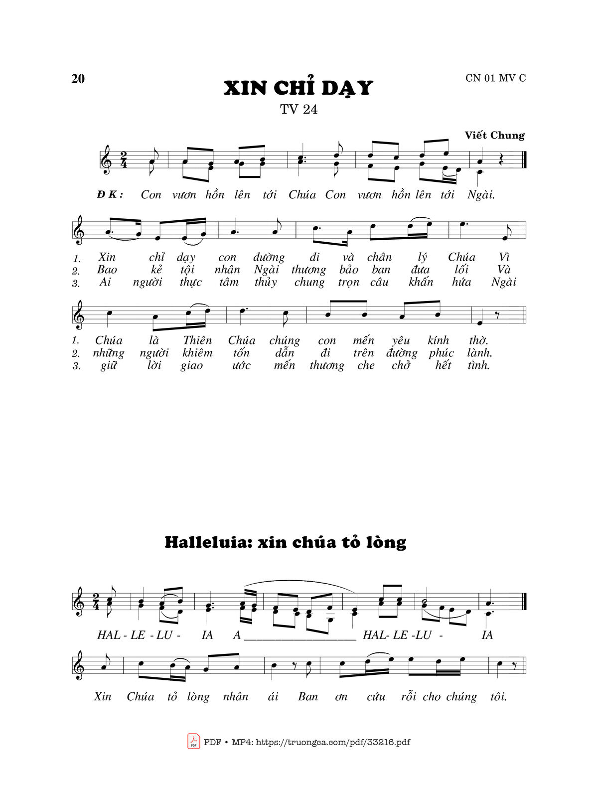 Sheet nhạc có nốt Thánh Vịnh 24, Xin Chỉ Dậy của nhạc sĩ Viết Chung và file PDF nốt nhạc đăng lên đây nhằm giúp các bạn xướng âm cho đúng nốt và hát thêm hay, chỉ mang tính chất tham khảo, không có mục đích thương mại. Bản quyền thuộc về tác giả và tổ chức nắm bản quyền, Truongca.com không giữ bất kỳ bản quyền của nội dung nào cả. Các bạn có thể tải về bản PDF chất lượng cao, gồm khuông nhạc có nốt với đường link file PDF bên trên.