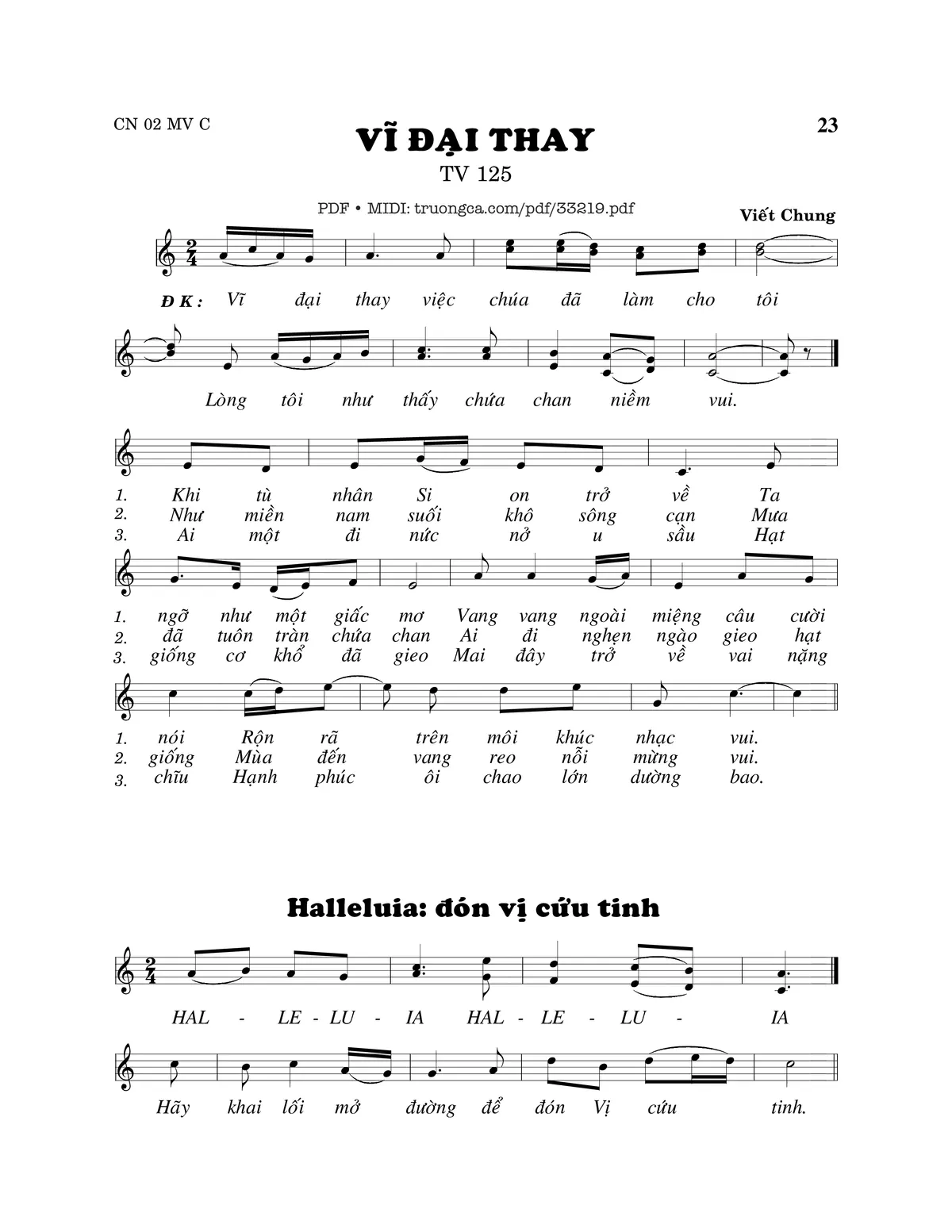 Sheet nhạc có nốt Thánh Vịnh 125, Vĩ Đại Thay của nhạc sĩ Viết Chung và file PDF nốt nhạc đăng lên đây nhằm giúp các bạn xướng âm cho đúng nốt và hát thêm hay, chỉ mang tính chất tham khảo, không có mục đích thương mại. Bản quyền thuộc về tác giả và tổ chức nắm bản quyền, Truongca.com không giữ bất kỳ bản quyền của nội dung nào cả. Các bạn có thể tải về bản PDF chất lượng cao, gồm khuông nhạc có nốt với đường link file PDF bên trên.