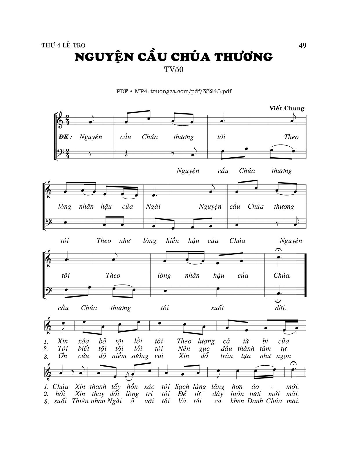 Sheet nhạc có nốt Thánh Vịnh 50, Nguyện Cầu Chúa Thương của nhạc sĩ Viết Chung và file PDF nốt nhạc đăng lên đây nhằm giúp các bạn xướng âm cho đúng nốt và hát thêm hay, chỉ mang tính chất tham khảo, không có mục đích thương mại. Bản quyền thuộc về tác giả và tổ chức nắm bản quyền, Truongca.com không giữ bất kỳ bản quyền của nội dung nào cả. Các bạn có thể tải về bản PDF chất lượng cao, gồm khuông nhạc có nốt với đường link file PDF bên trên.