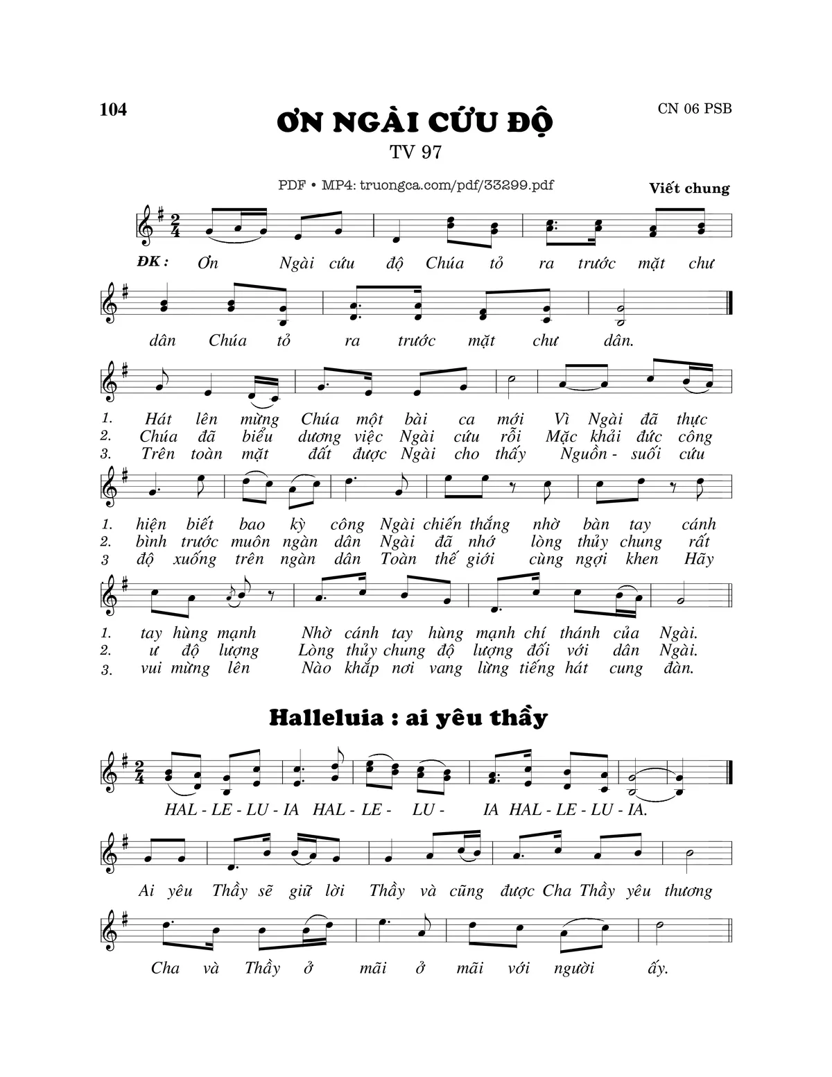 Sheet nhạc có nốt Thánh Vịnh 97, Ơn Ngài Cứu Độ của nhạc sĩ Viết Chung và file PDF nốt nhạc đăng lên đây nhằm giúp các bạn xướng âm cho đúng nốt và hát thêm hay, chỉ mang tính chất tham khảo, không có mục đích thương mại. Bản quyền thuộc về tác giả và tổ chức nắm bản quyền, Truongca.com không giữ bất kỳ bản quyền của nội dung nào cả. Các bạn có thể tải về bản PDF chất lượng cao, gồm khuông nhạc có nốt với đường link file PDF bên trên.