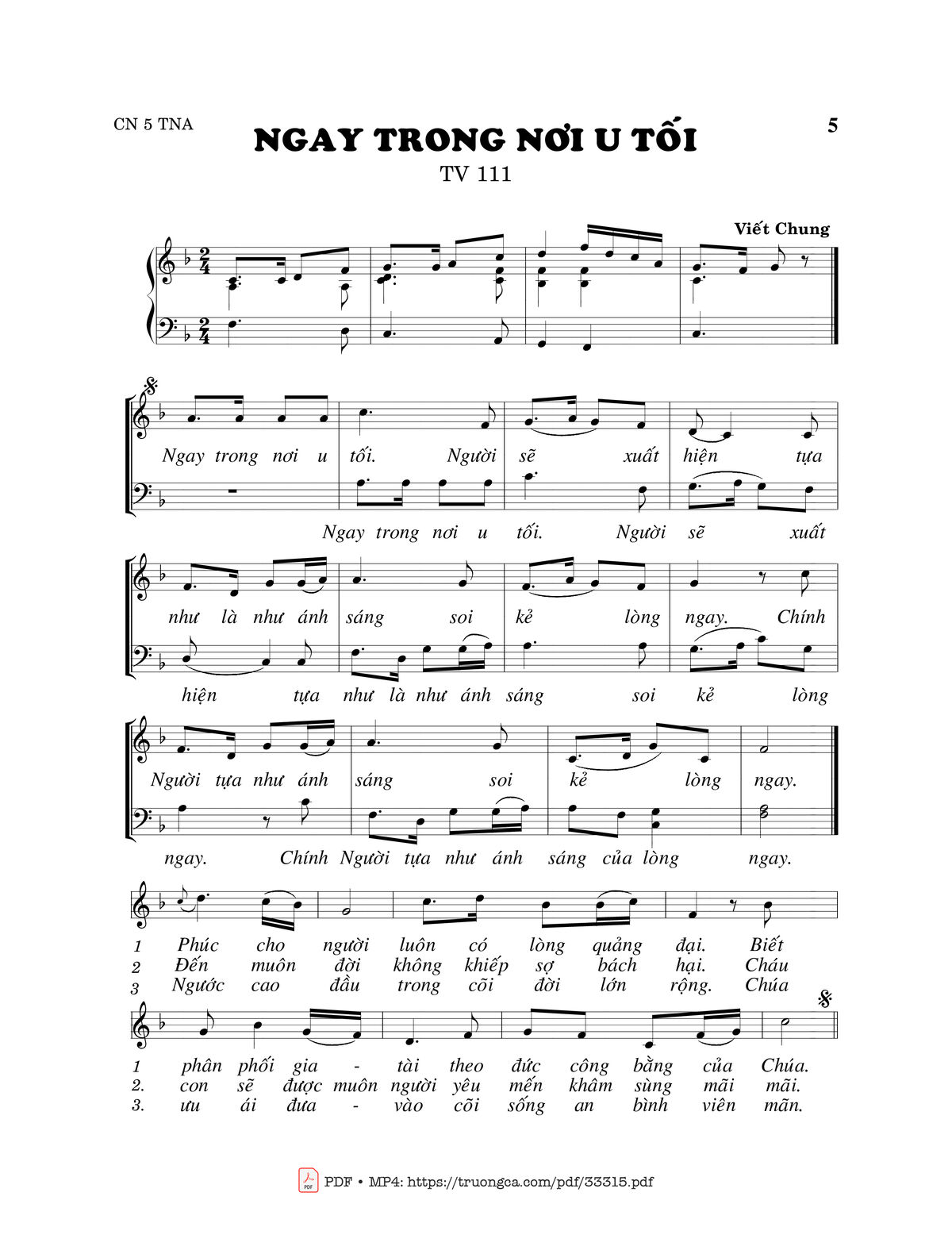 Sheet nhạc có nốt Thánh Vịnh 111, Ngay Trong Noi U Tối của nhạc sĩ Viết Chung và file PDF nốt nhạc đăng lên đây nhằm giúp các bạn xướng âm cho đúng nốt và hát thêm hay, chỉ mang tính chất tham khảo, không có mục đích thương mại. Bản quyền thuộc về tác giả và tổ chức nắm bản quyền, Truongca.com không giữ bất kỳ bản quyền của nội dung nào cả. Các bạn có thể tải về bản PDF chất lượng cao, gồm khuông nhạc có nốt với đường link file PDF bên trên.