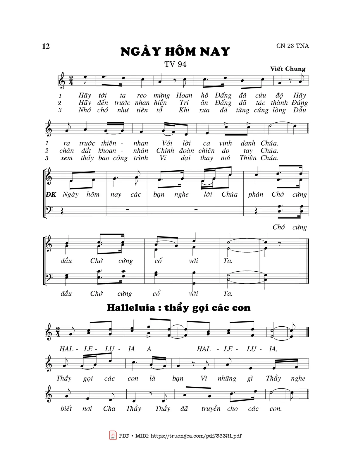 Sheet nhạc có nốt Thánh Vịnh 94, Ngày Hôm Nay của nhạc sĩ Viết Chung và file PDF nốt nhạc đăng lên đây nhằm giúp các bạn xướng âm cho đúng nốt và hát thêm hay, chỉ mang tính chất tham khảo, không có mục đích thương mại. Bản quyền thuộc về tác giả và tổ chức nắm bản quyền, Truongca.com không giữ bất kỳ bản quyền của nội dung nào cả. Các bạn có thể tải về bản PDF chất lượng cao, gồm khuông nhạc có nốt với đường link file PDF bên trên.