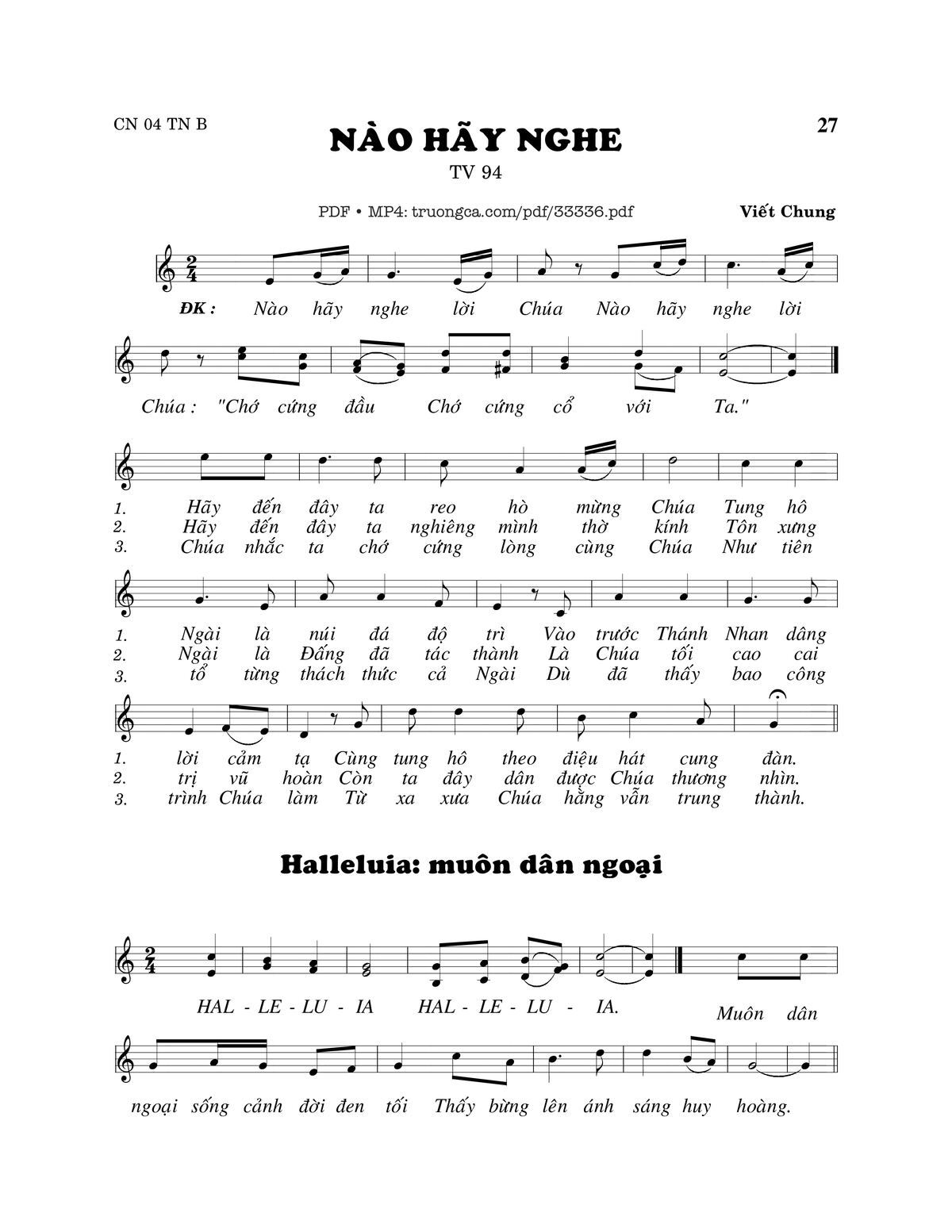 Sheet nhạc có nốt Thánh Vịnh 94, Nào Hãy Nghe của nhạc sĩ Viết Chung và file PDF nốt nhạc đăng lên đây nhằm giúp các bạn xướng âm cho đúng nốt và hát thêm hay, chỉ mang tính chất tham khảo, không có mục đích thương mại. Bản quyền thuộc về tác giả và tổ chức nắm bản quyền, Truongca.com không giữ bất kỳ bản quyền của nội dung nào cả. Các bạn có thể tải về bản PDF chất lượng cao, gồm khuông nhạc có nốt với đường link file PDF bên trên.