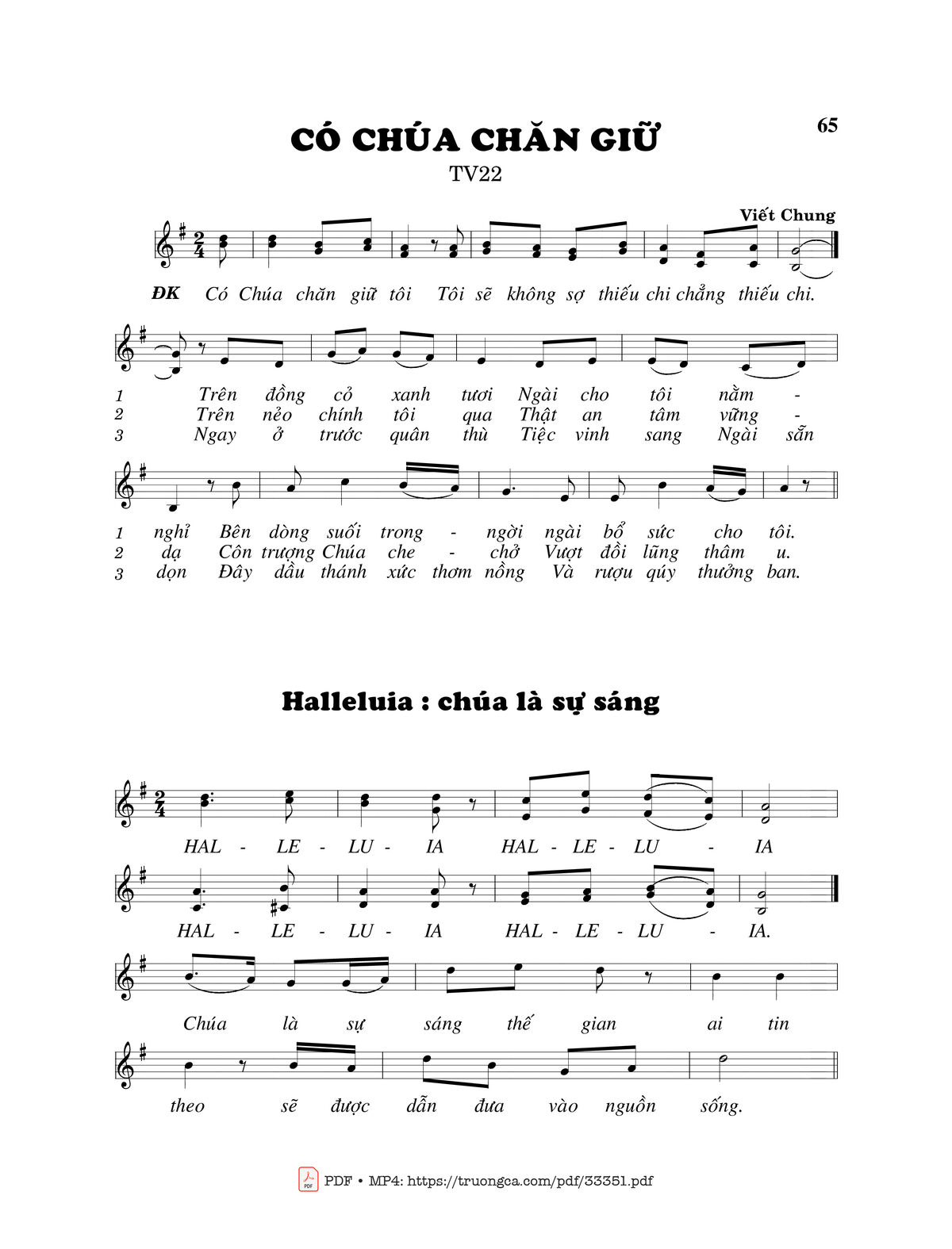 Sheet nhạc có nốt Thánh Vịnh 22, Có Chúa Chăn Giữ của nhạc sĩ Viết Chung và file PDF nốt nhạc đăng lên đây nhằm giúp các bạn xướng âm cho đúng nốt và hát thêm hay, chỉ mang tính chất tham khảo, không có mục đích thương mại. Bản quyền thuộc về tác giả và tổ chức nắm bản quyền, Truongca.com không giữ bất kỳ bản quyền của nội dung nào cả. Các bạn có thể tải về bản PDF chất lượng cao, gồm khuông nhạc có nốt với đường link file PDF bên trên.