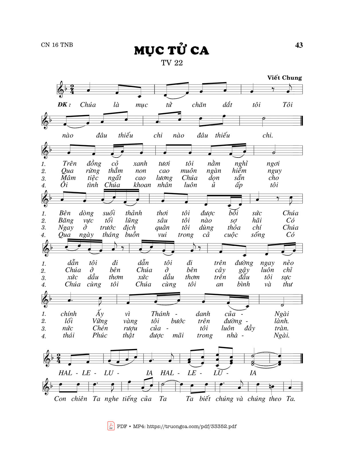 Sheet nhạc có nốt Thánh Vịnh 22, Mục Tử Ca của nhạc sĩ Viết Chung và file PDF nốt nhạc đăng lên đây nhằm giúp các bạn xướng âm cho đúng nốt và hát thêm hay, chỉ mang tính chất tham khảo, không có mục đích thương mại. Bản quyền thuộc về tác giả và tổ chức nắm bản quyền, Truongca.com không giữ bất kỳ bản quyền của nội dung nào cả. Các bạn có thể tải về bản PDF chất lượng cao, gồm khuông nhạc có nốt với đường link file PDF bên trên.