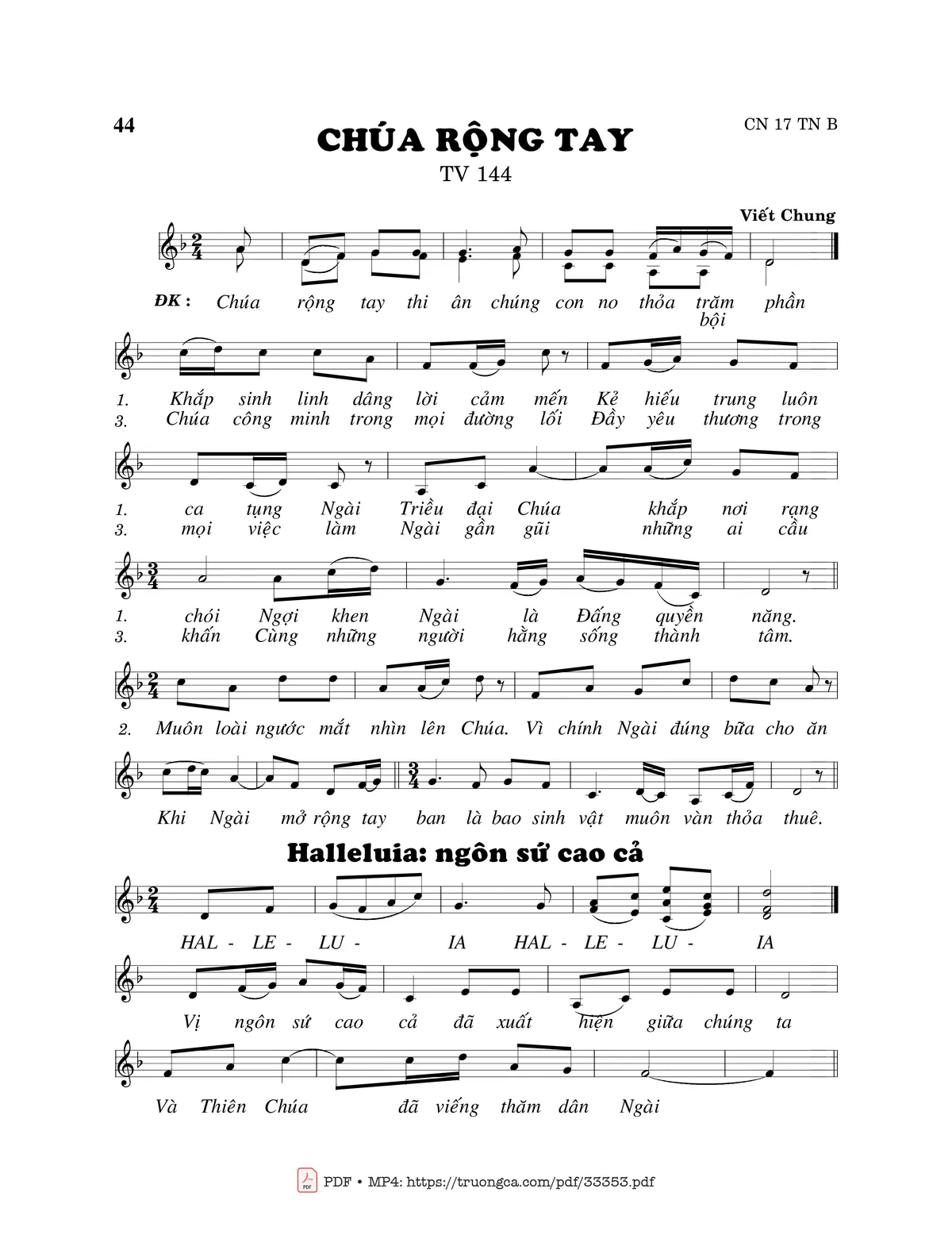 Sheet nhạc có nốt Thánh Vịnh 144, Chúa Rộng Tay của nhạc sĩ Viết Chung và file PDF nốt nhạc đăng lên đây nhằm giúp các bạn xướng âm cho đúng nốt và hát thêm hay, chỉ mang tính chất tham khảo, không có mục đích thương mại. Bản quyền thuộc về tác giả và tổ chức nắm bản quyền, Truongca.com không giữ bất kỳ bản quyền của nội dung nào cả. Các bạn có thể tải về bản PDF chất lượng cao, gồm khuông nhạc có nốt với đường link file PDF bên trên.