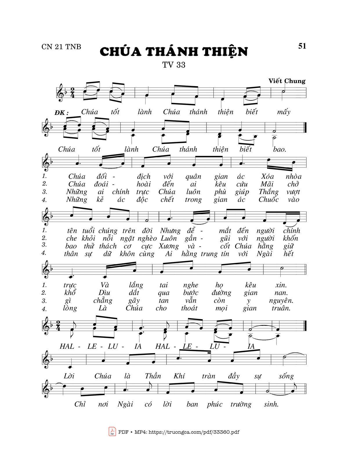 Sheet nhạc có nốt Thánh Vịnh 33, Chúa Thánh Thiện của nhạc sĩ Viết Chung và file PDF nốt nhạc đăng lên đây nhằm giúp các bạn xướng âm cho đúng nốt và hát thêm hay, chỉ mang tính chất tham khảo, không có mục đích thương mại. Bản quyền thuộc về tác giả và tổ chức nắm bản quyền, Truongca.com không giữ bất kỳ bản quyền của nội dung nào cả. Các bạn có thể tải về bản PDF chất lượng cao, gồm khuông nhạc có nốt với đường link file PDF bên trên.