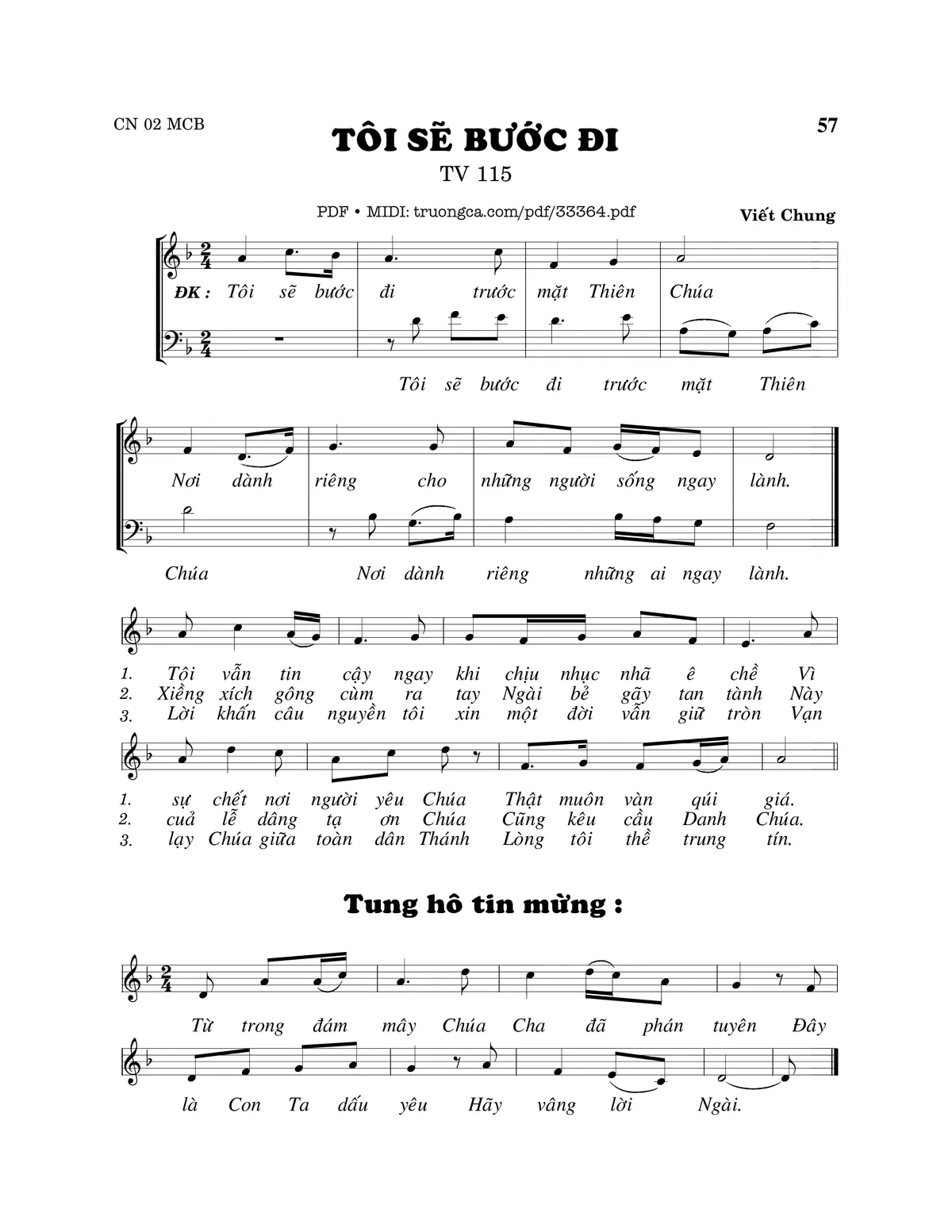 Sheet nhạc có nốt Thánh Vịnh 114, Tôi Sẽ Bước Đi của nhạc sĩ Viết Chung và file PDF nốt nhạc đăng lên đây nhằm giúp các bạn xướng âm cho đúng nốt và hát thêm hay, chỉ mang tính chất tham khảo, không có mục đích thương mại. Bản quyền thuộc về tác giả và tổ chức nắm bản quyền, Truongca.com không giữ bất kỳ bản quyền của nội dung nào cả. Các bạn có thể tải về bản PDF chất lượng cao, gồm khuông nhạc có nốt với đường link file PDF bên trên.